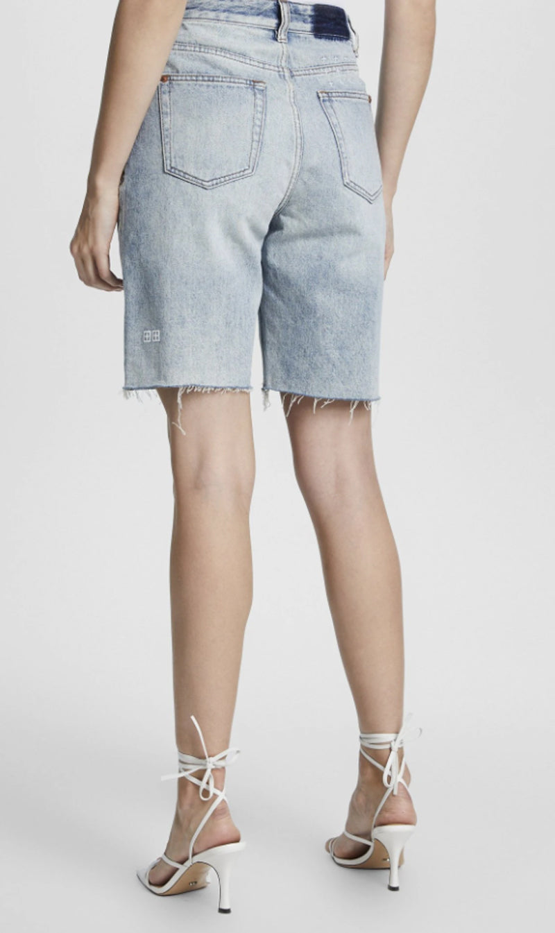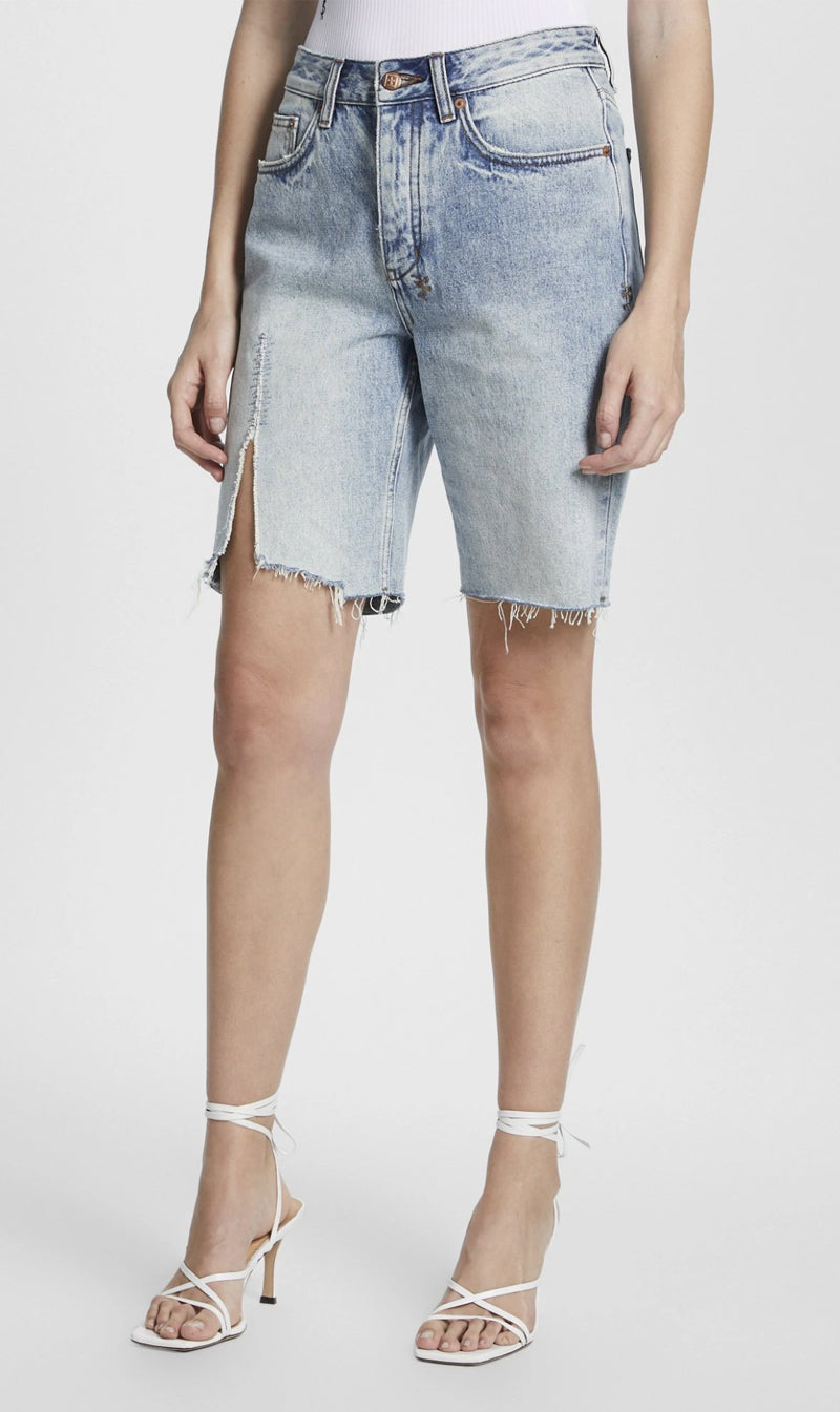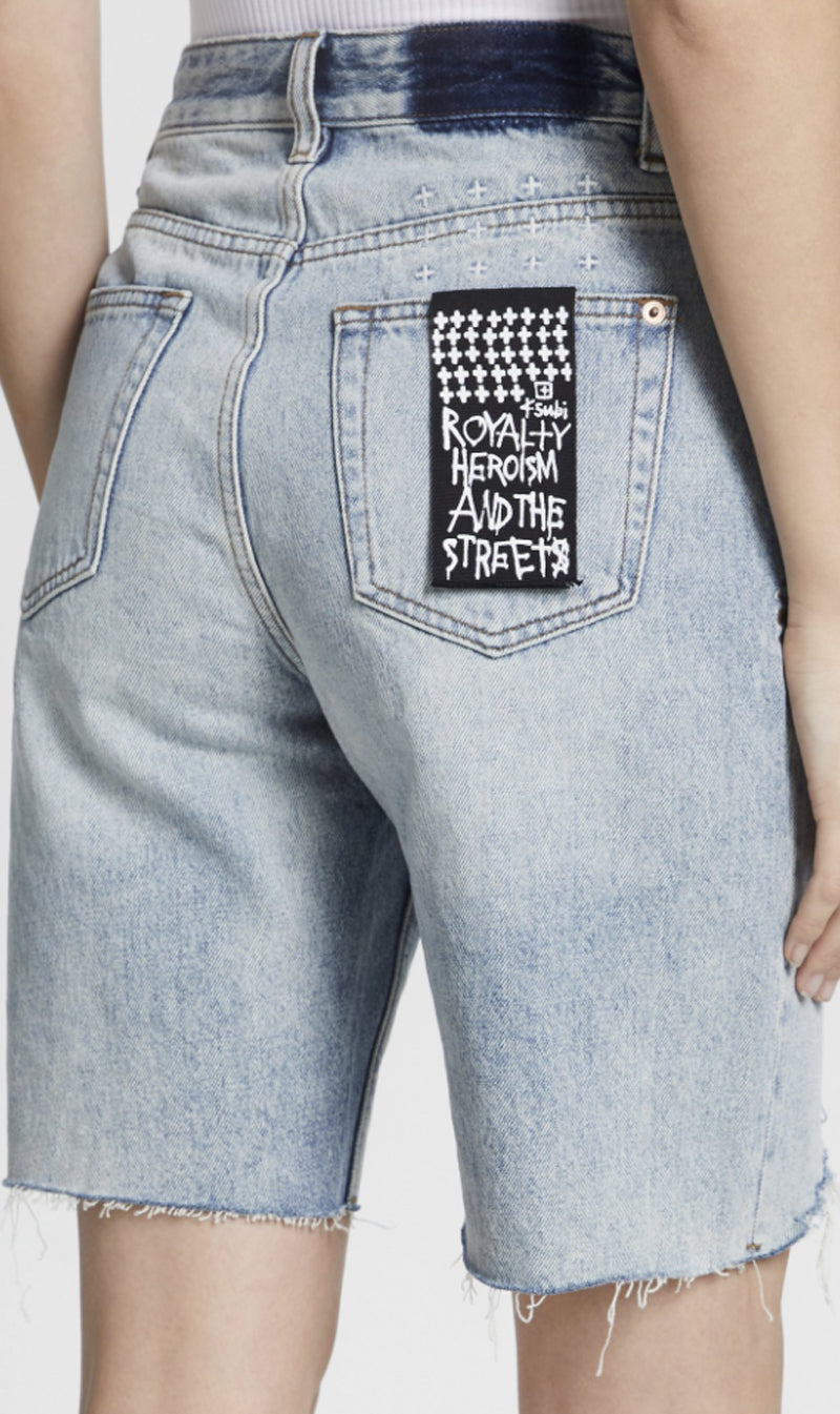 The Ksubi Brooklyn Short in Lifetime Ripped is made from premium rigid denim in mid-blue wash with stonewash and light contrast wear. It is a pair of relaxed fit shorts with a mid rise waist and features classic five pocket styling, vertical leg slash with repair stitching, light grinding, Ksubi t-box and back cross embroidery.