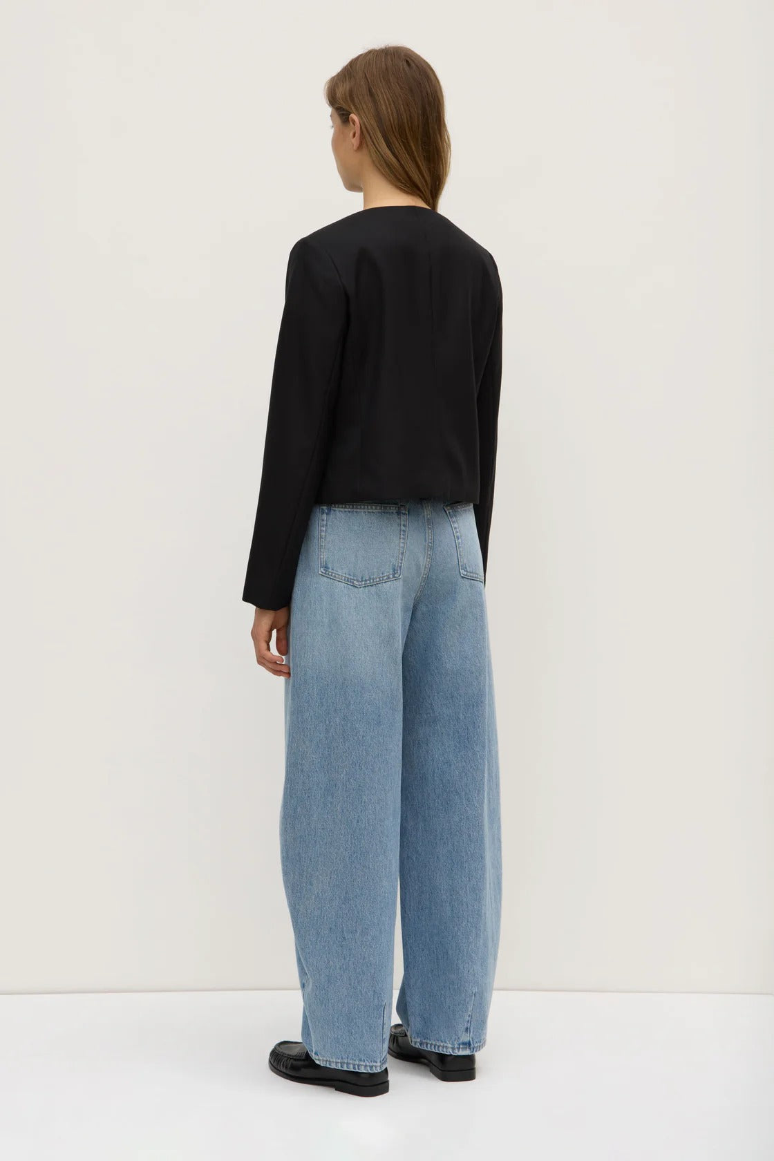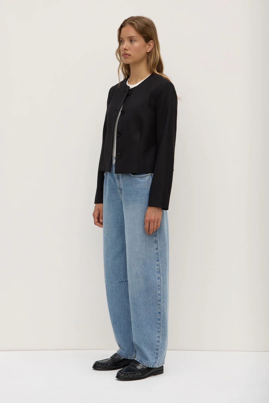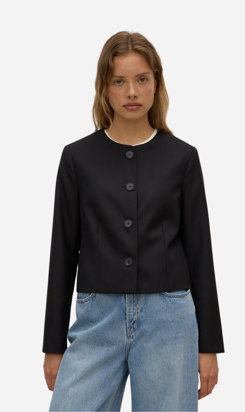 Boxy, tailored jacket crafted from 100% wool. Designed for layering over tees and shirting, it features a collarless crew neckline and button down front.