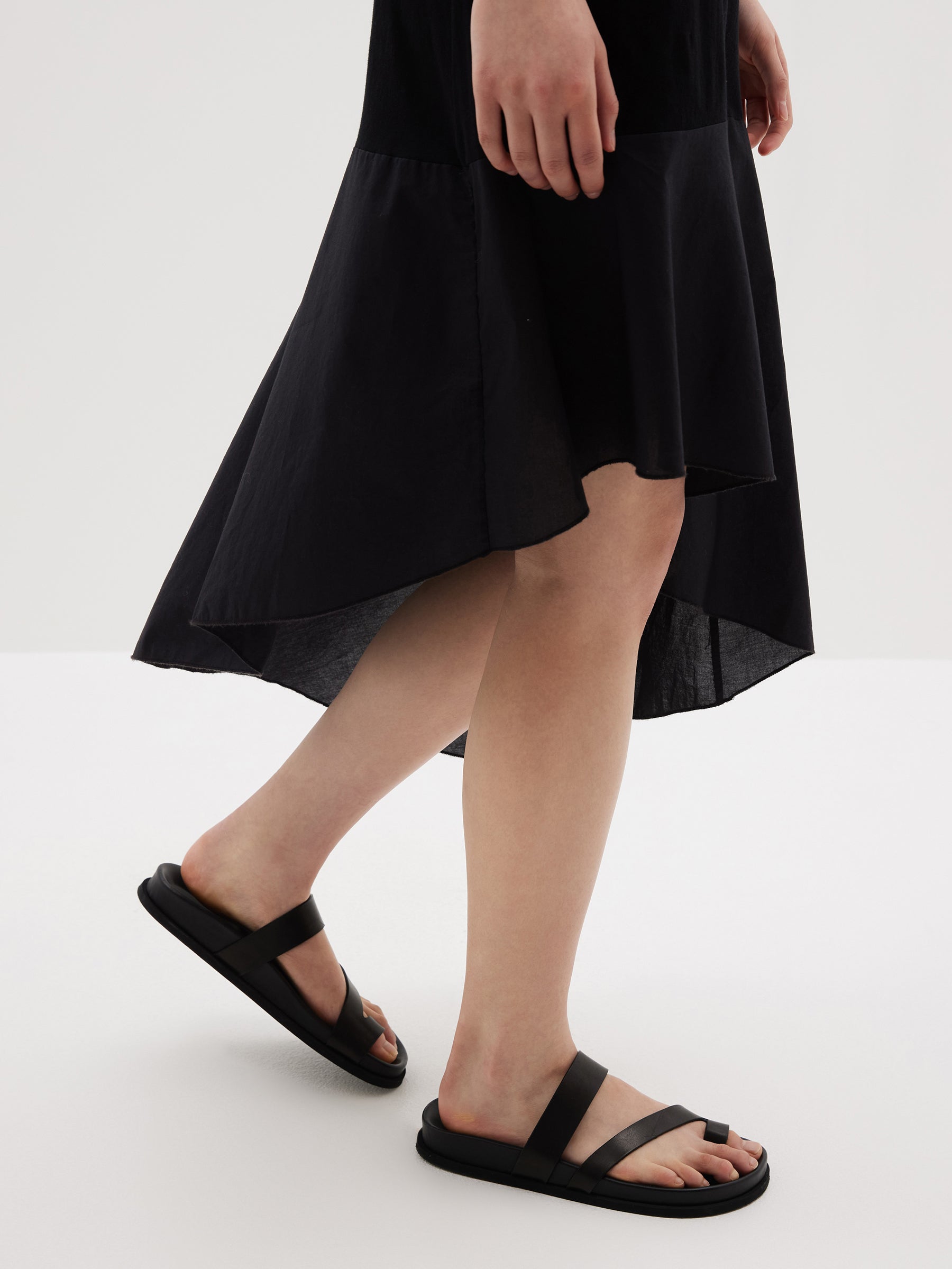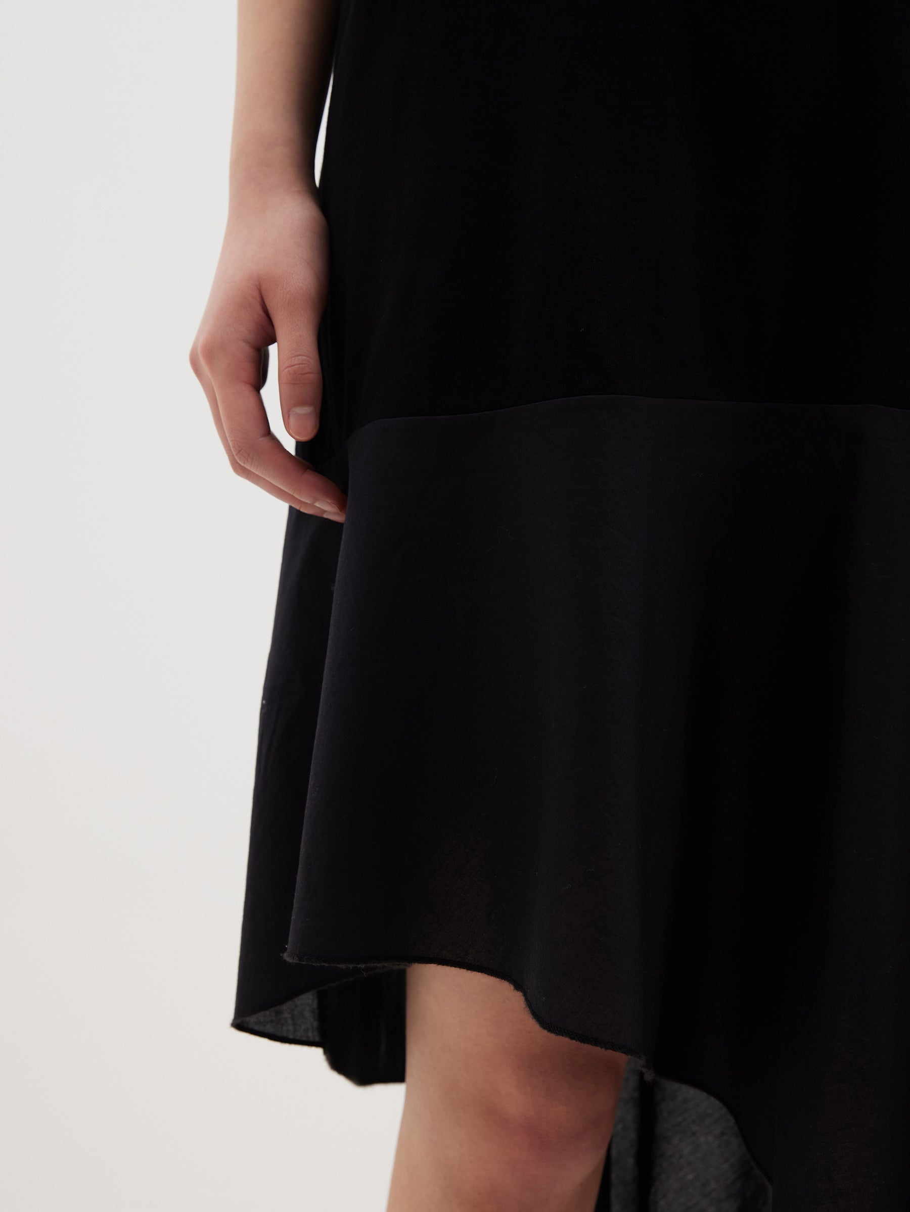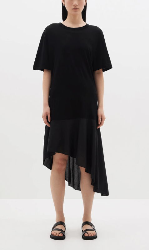 The contrast t.shirt dress is a relaxed fit t.shirt dress in single jersey. featuring a contrasting lightweight cotton poplin skirt with asymmetrical detail.