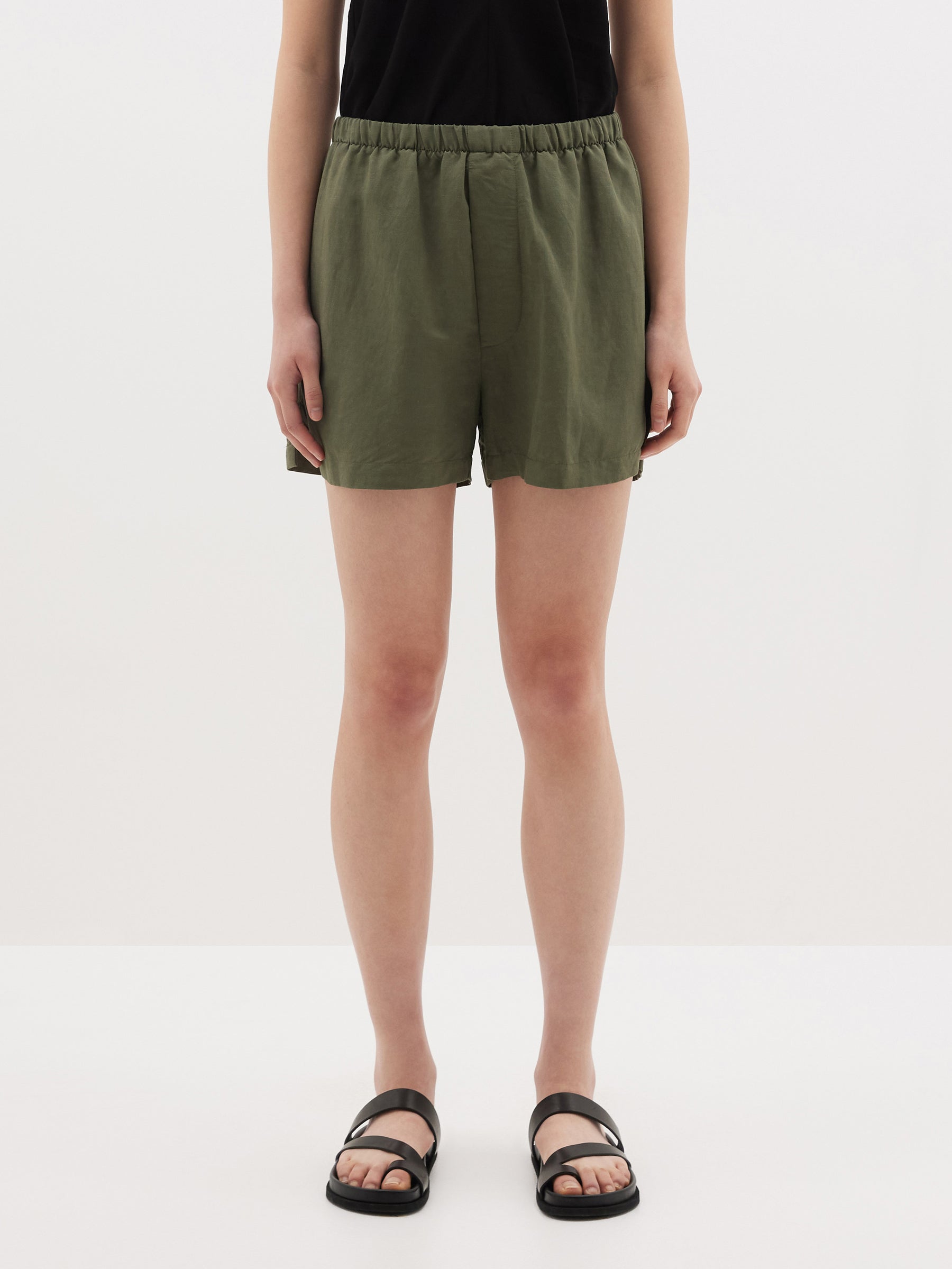 Indulge in the ease of slipping into these featherweight linen shorts, effortlessly adorned with an elasticized waistband for comfort. Notably equipped with practical side entry pockets and a convenient drawcord for a customizable fit. Elevating the style is the distinctive bassike rear topstitching detail that adds a signature touch of sophistication.