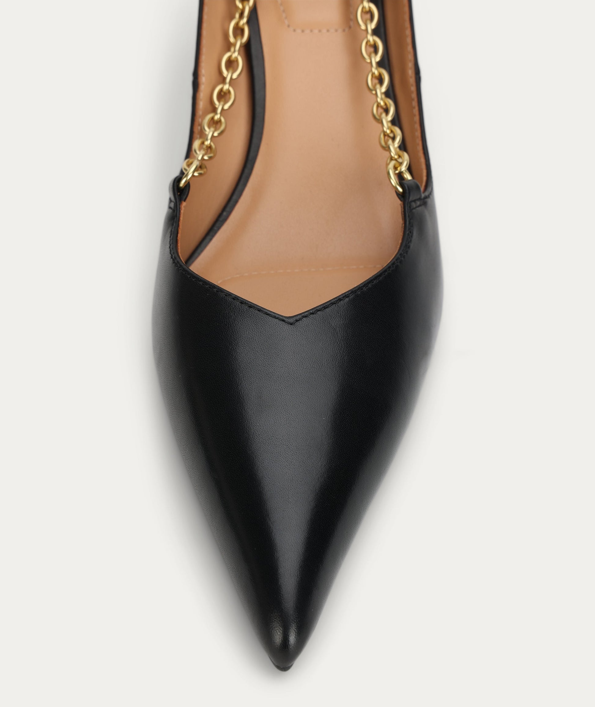 The chic Epona Heel in Black is crafted from supple Lamb Nappa. It features a pointed toe, tapered heel, and padded fixed insole. Finished with adjustable brass chain detailing and a signature marque charm.