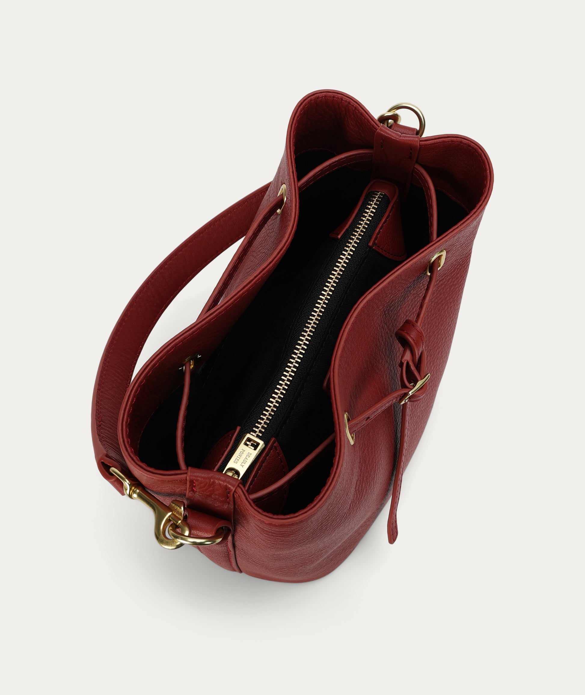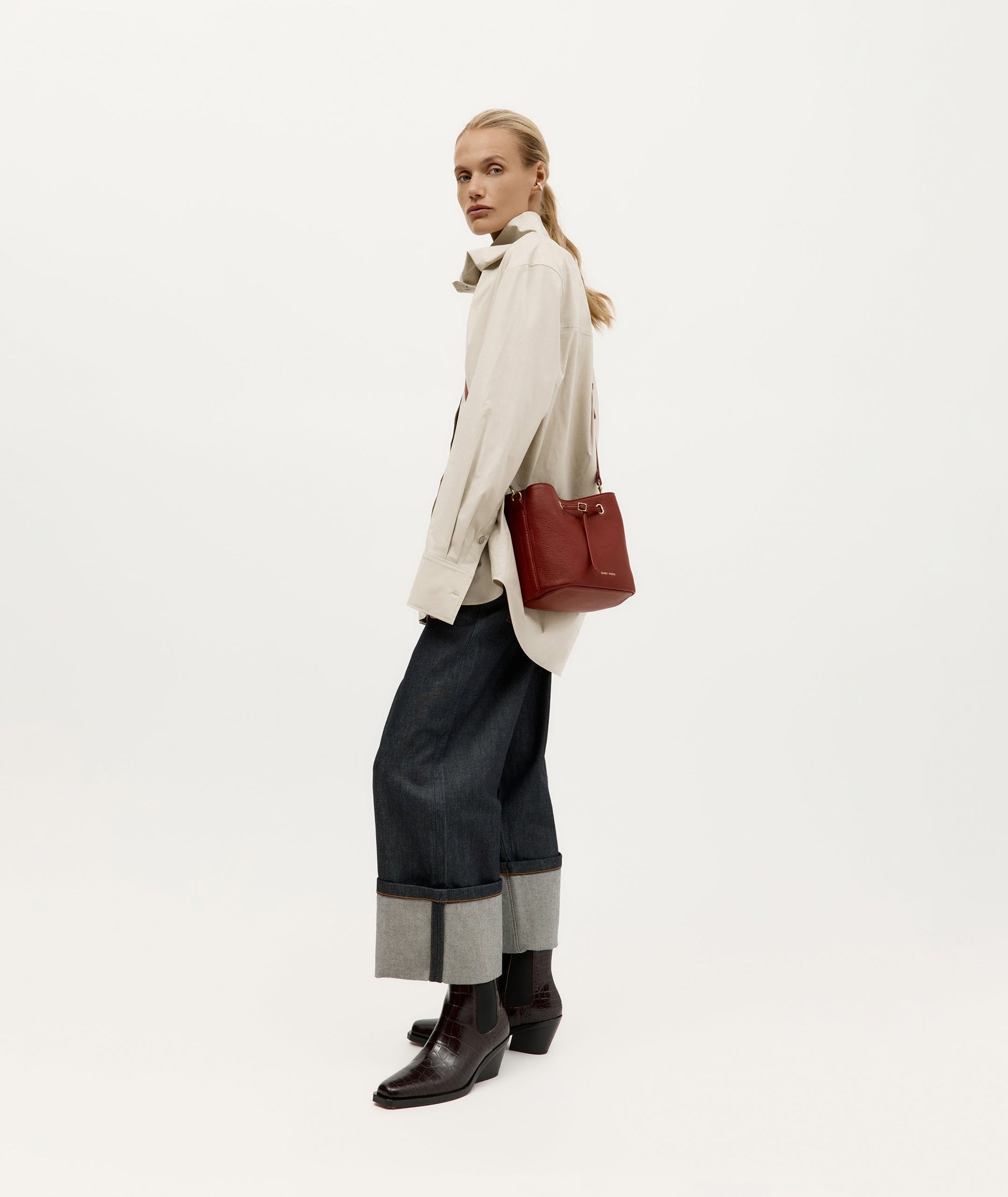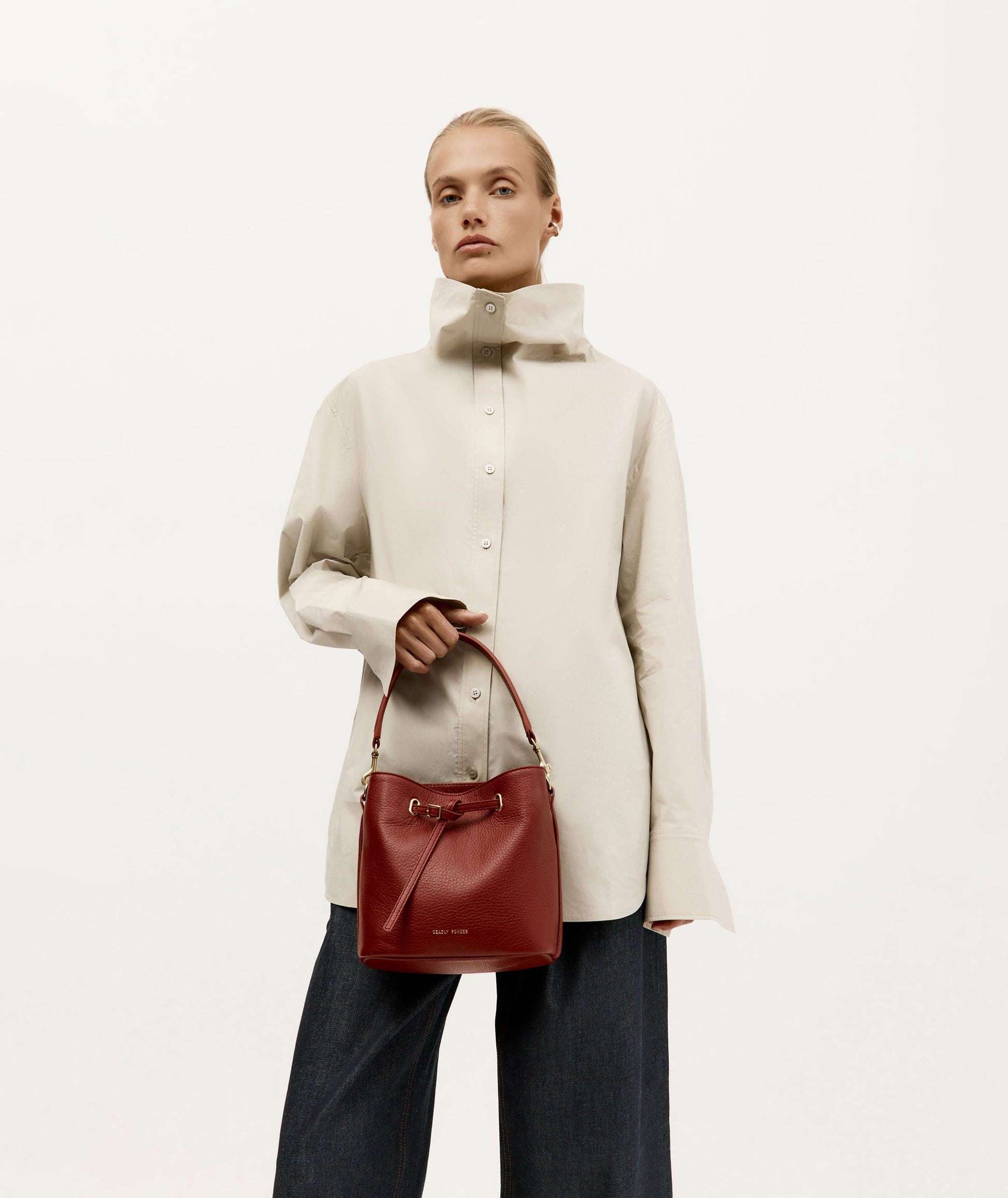 A new take on the classic bucket bag, Mr Penny blends intricate design with everyday practicality. Featuring a detachable top handle and an adjustable strap, he offers versatile carrying options. His leather strap detailing loops through brass eyelets, while a removable cotton pouch keeps your essentials secure. Crafted from buttery Calf Nappa leather and signature brass hardware.