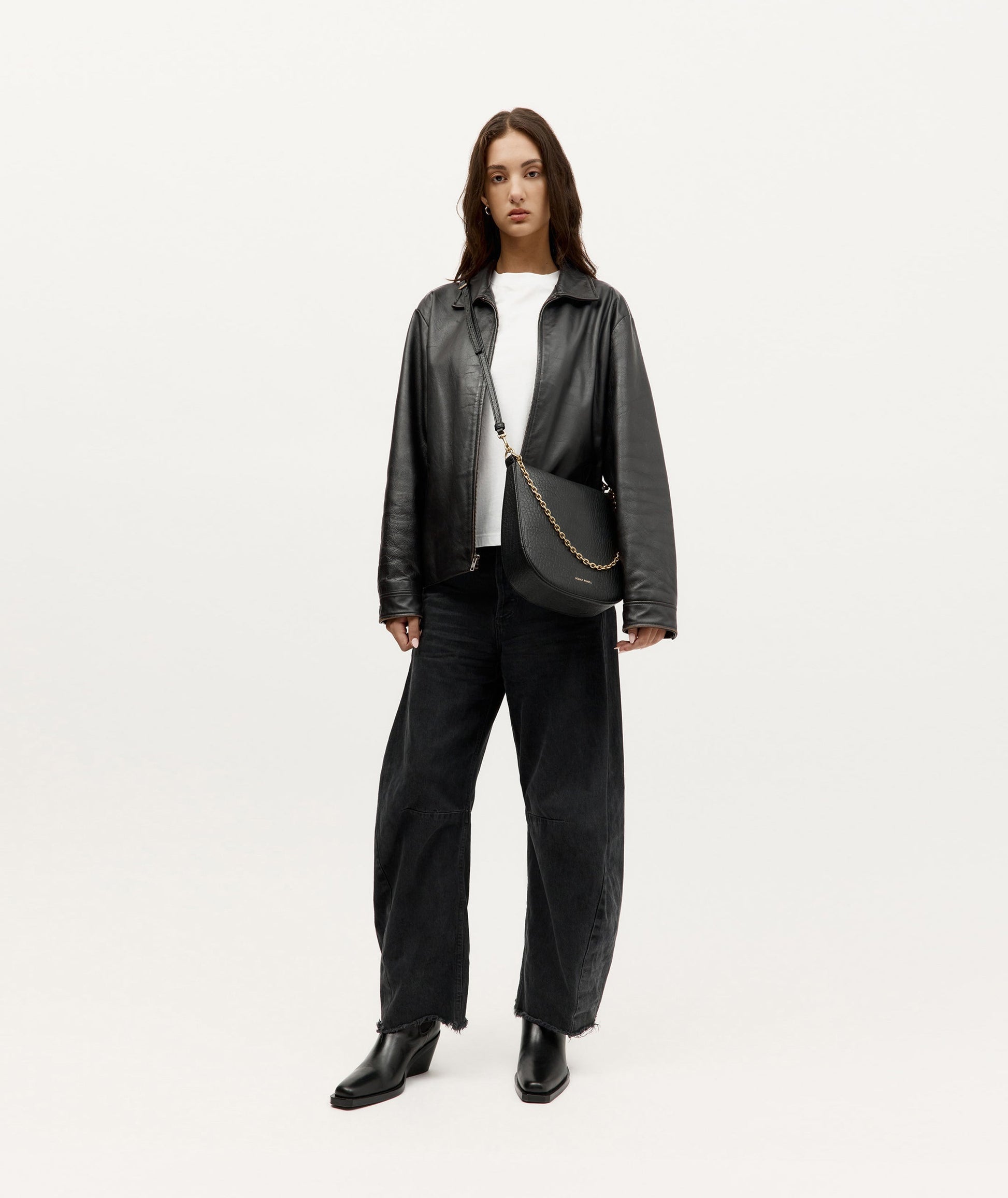 Mr Sling, an adaptation of the coveted Mr Sling Mini, debuts with soft leather folds and exposed gusset seam detailing. Handcrafted from New Zealand Merino Lamb - named "Bulle" leather. Mr Sling features a detachable brass chain front handle, a detachable leather top handle, and an adjustable and detachable leather strap.