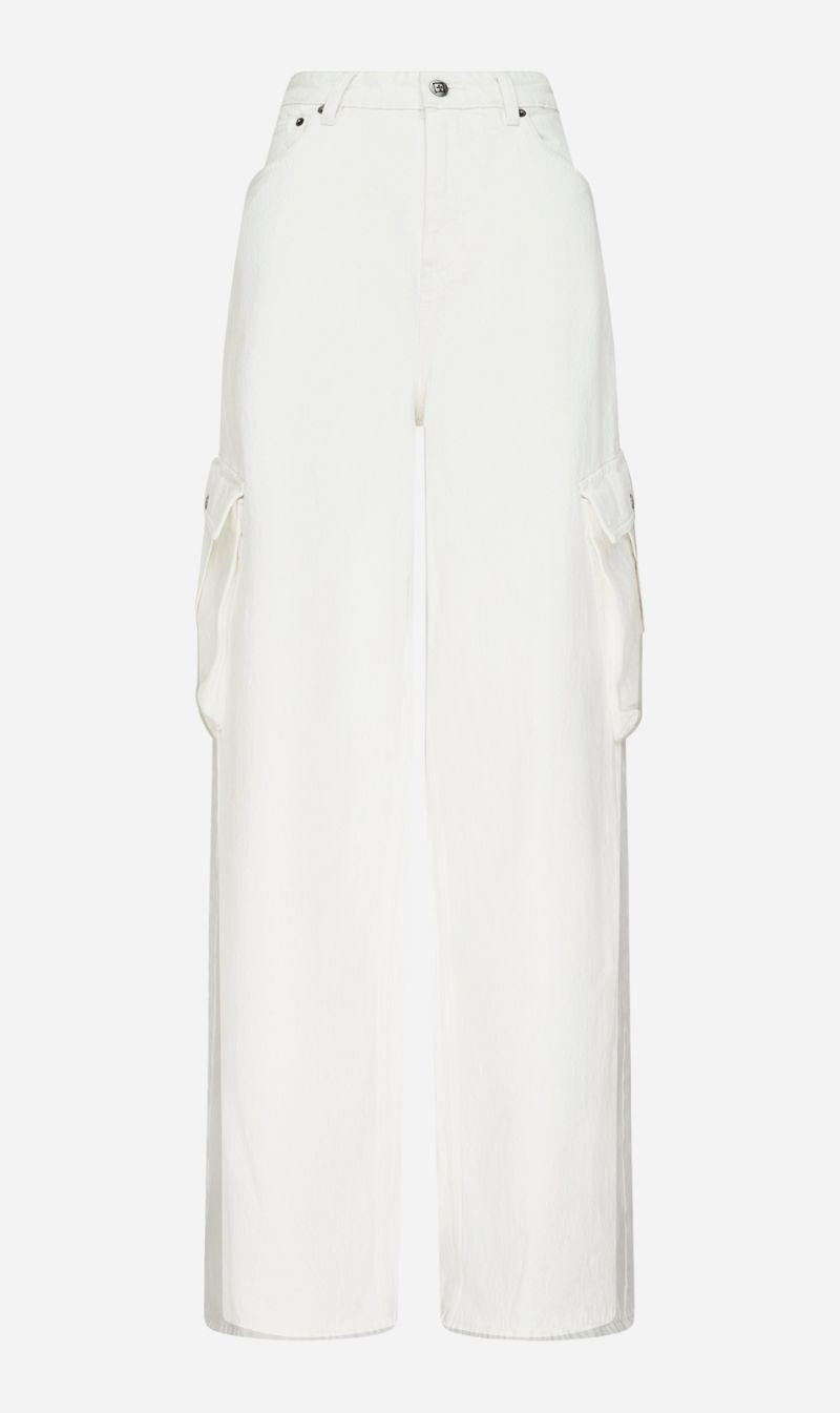 Relaxed wide leg jean with a mid rise. Made from a premium Ecru denim with a tonal top stitch. Designed with longer-length to stack stylishly above the ankle. It features side facing angled cargo pockets, classic five-pocket styling with Ksubi branded hardware, T-box and 3x4 embroidery, removeable pocket tag attached to wearer's right back pocket. Style back with Oversized Shirt Ecru.