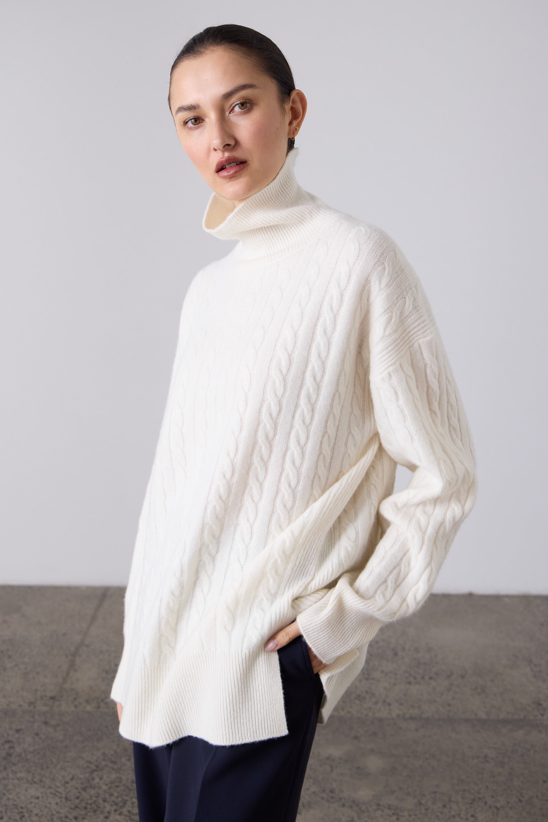 A stylish slouchy cable knit is a must-have in any woman's wardrobe. Pair it with a bold skirt, your favourite jeans, or slim trousers for a cozy yet chic look. We love the luxurious feeling of this style in winter white.