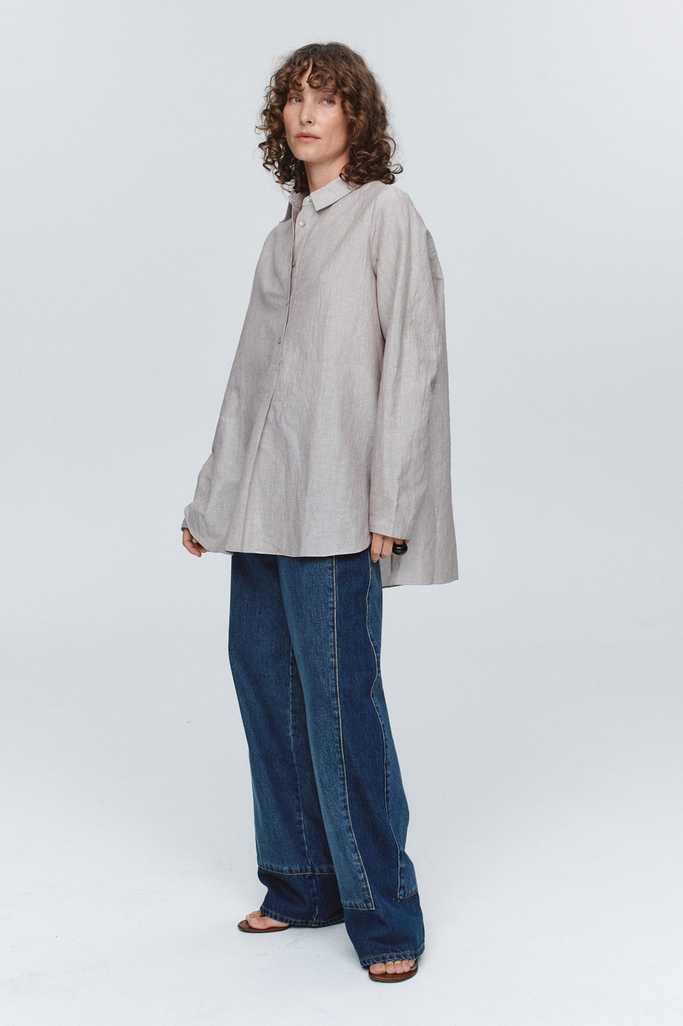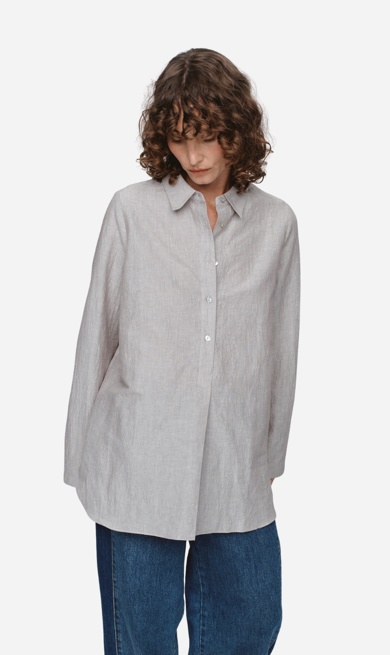 subtle textures stripe, this shirt is cut to an oversized shape that drapes with ease. It features a structured collar and a 5 button placket at the centre front for a clean, uninterrupted line. Set-in sleeves that fall to a hemmed cuff enhance the relaxed fit, while the curved hemline softens the shape and invites layering.