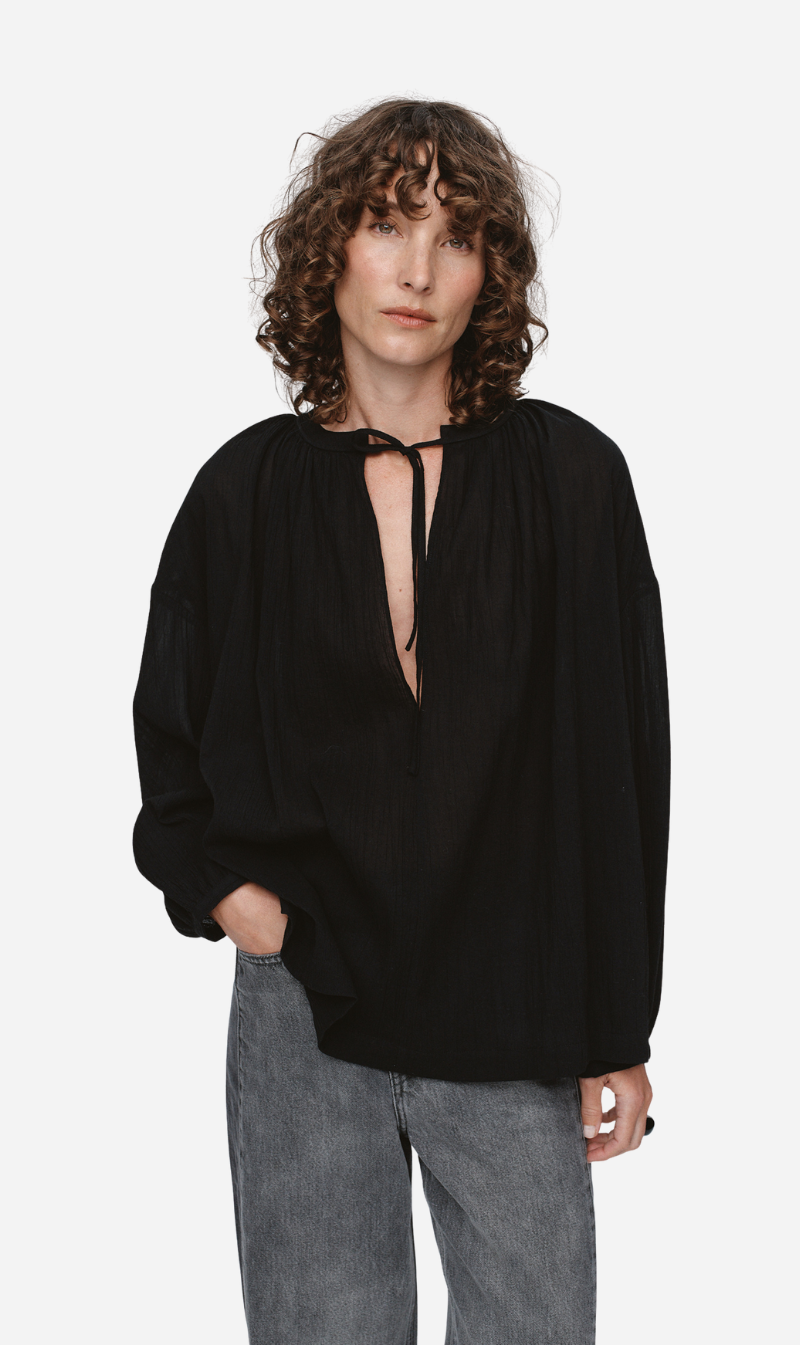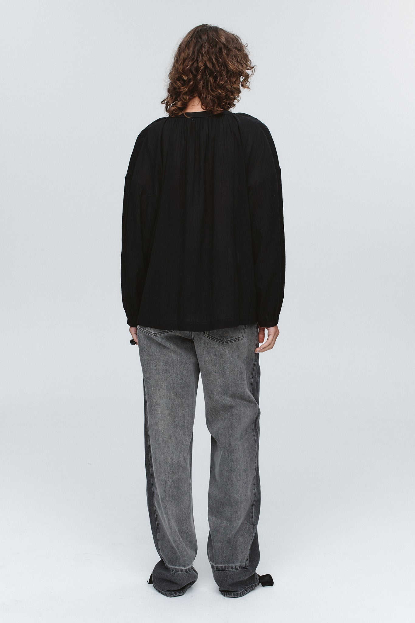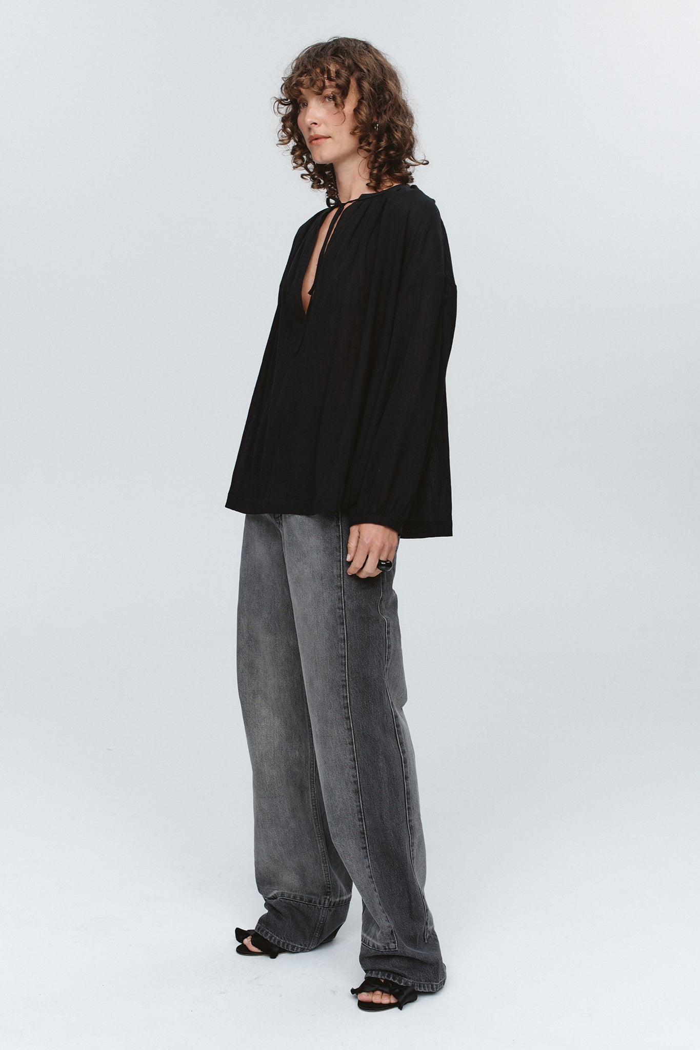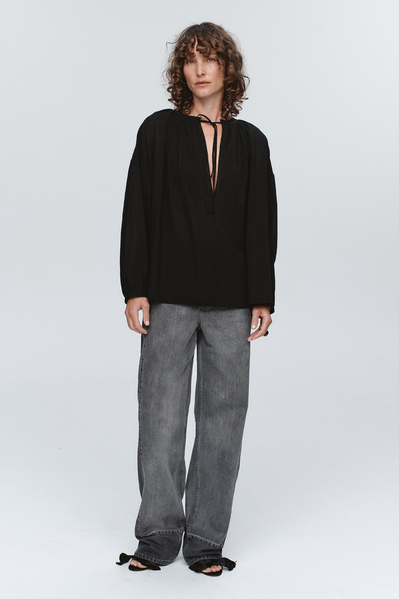 A relaxed-fit top constructed from lightweight 100% Cotton. Features a deep V-neckline with functional tie closure, shoulder gathers to add controlled volume and full-length sleeves with a loose, unstructured finish. The fabric's soft drape and breathable quality make it suitable for warm-weather wear.