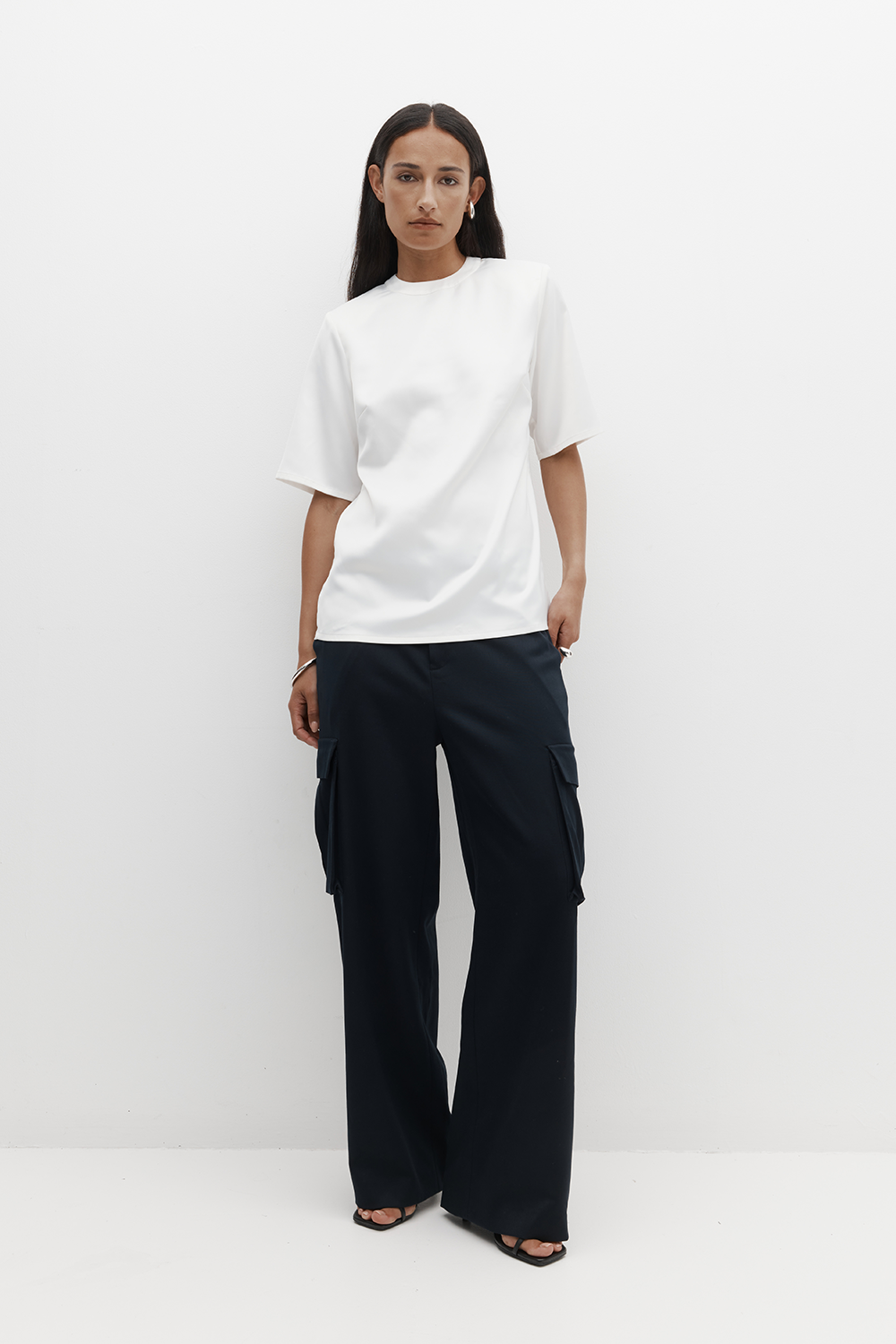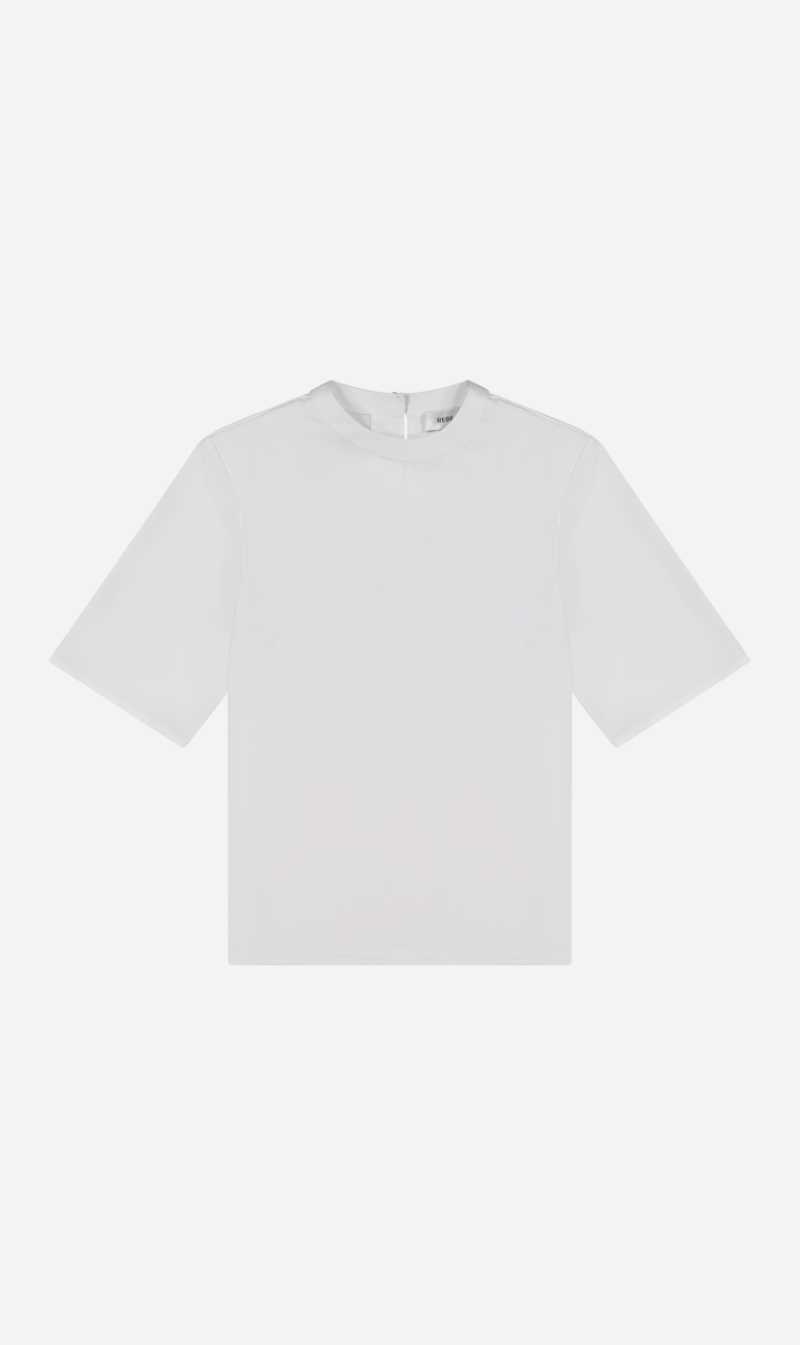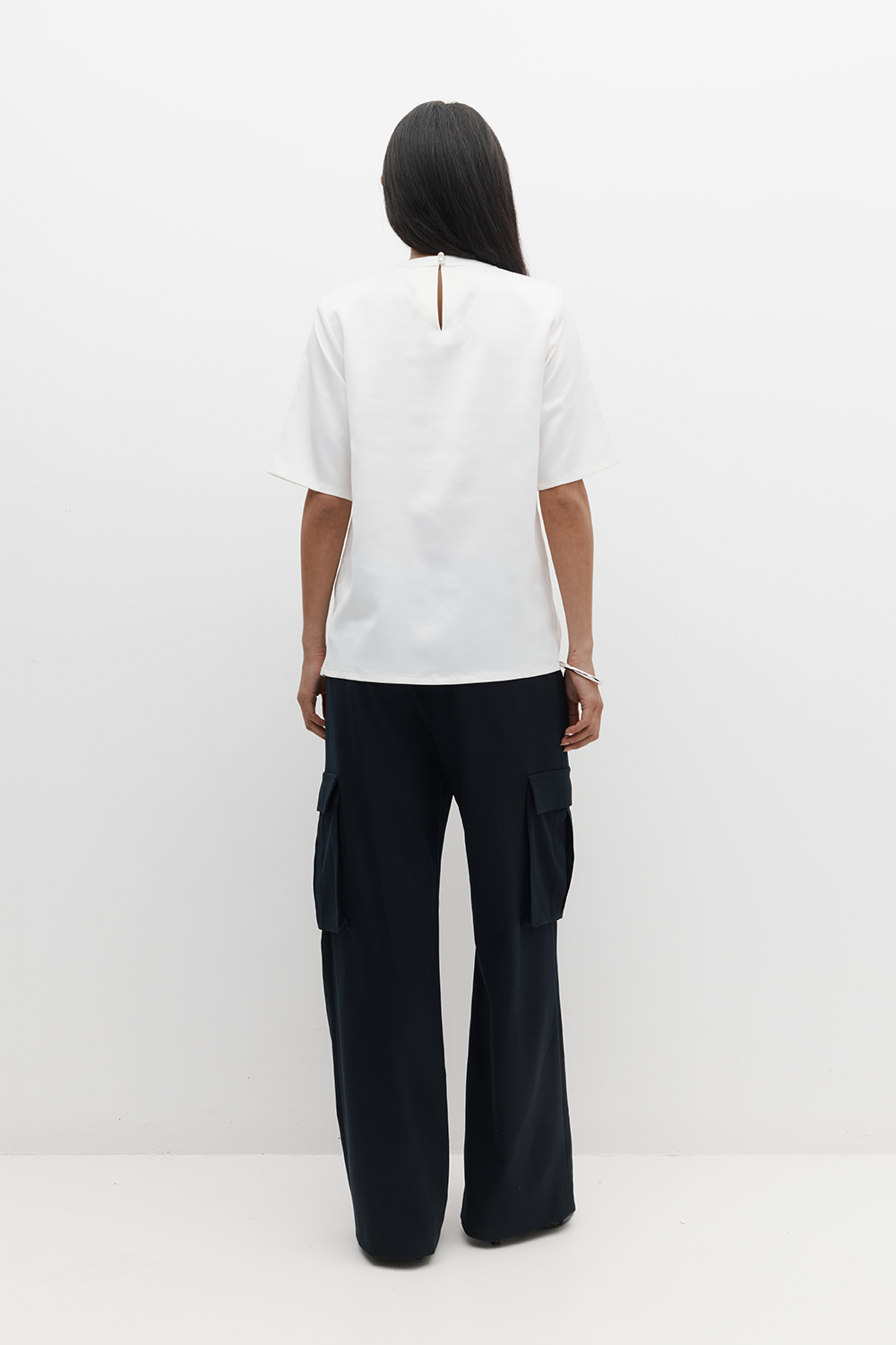 Elegant and easy to wear, this top is crafted from smooth satin in a relaxed, boxy silhouette reminiscent of your favourite tee. Detachable shoulder pads offer the option of added structure, with a keyhole back and faux pearl buttons. Machine washable for everyday ease.