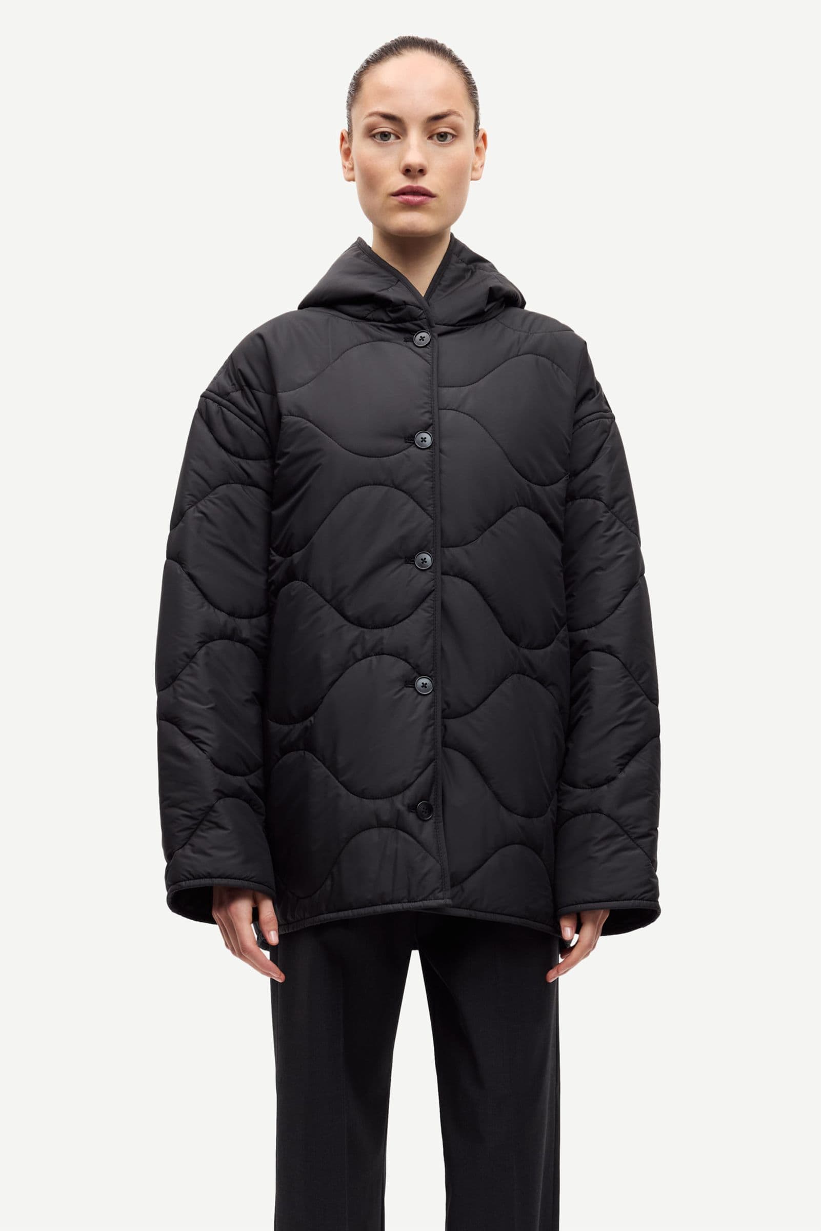 Hooded jacket with an oversized fit and dropped shoulders. Button closure on the front. Side slit pockets on the front. Printed Samsøe Samsøe branding on the back. Quilted pattern. Partially padded. Main material made from 100% recycled polyester. Cotton twill insert at the back. This product is GRS certified. Each stage of the supply chain has met strict social, environmental, and chemical requirements.