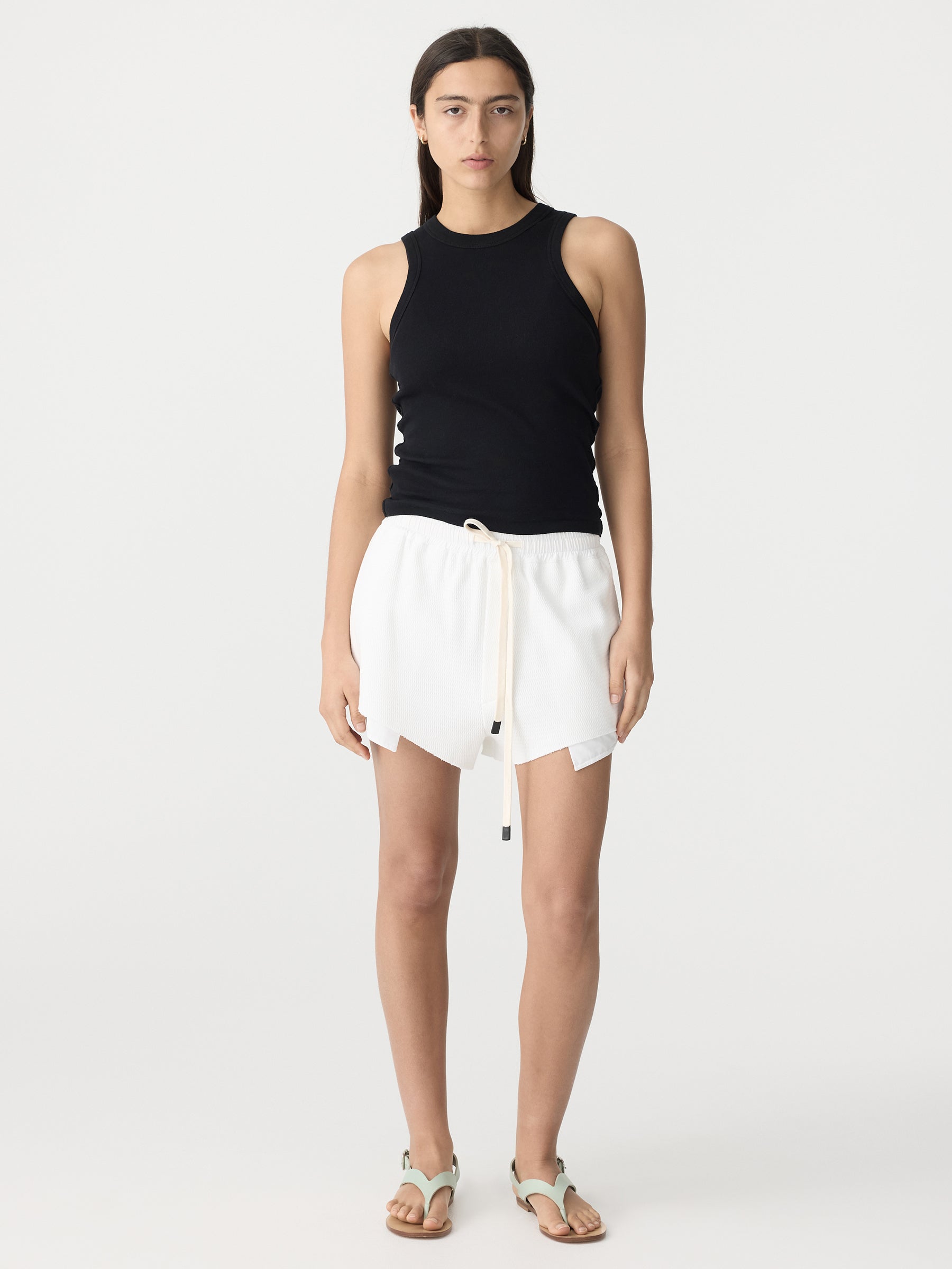 Designed for ease and comfort, the pocket detail waffle short are crafted from a 100% alternating organic cotton and heavy weight waffle construction. Designed to sit comfortable at the waist, the pull on style boasts a regular fit, loose-leg silhouette, elasticated waistband and side pockets. Refined by an external centre front drawcord and external hanging poplin pockets.