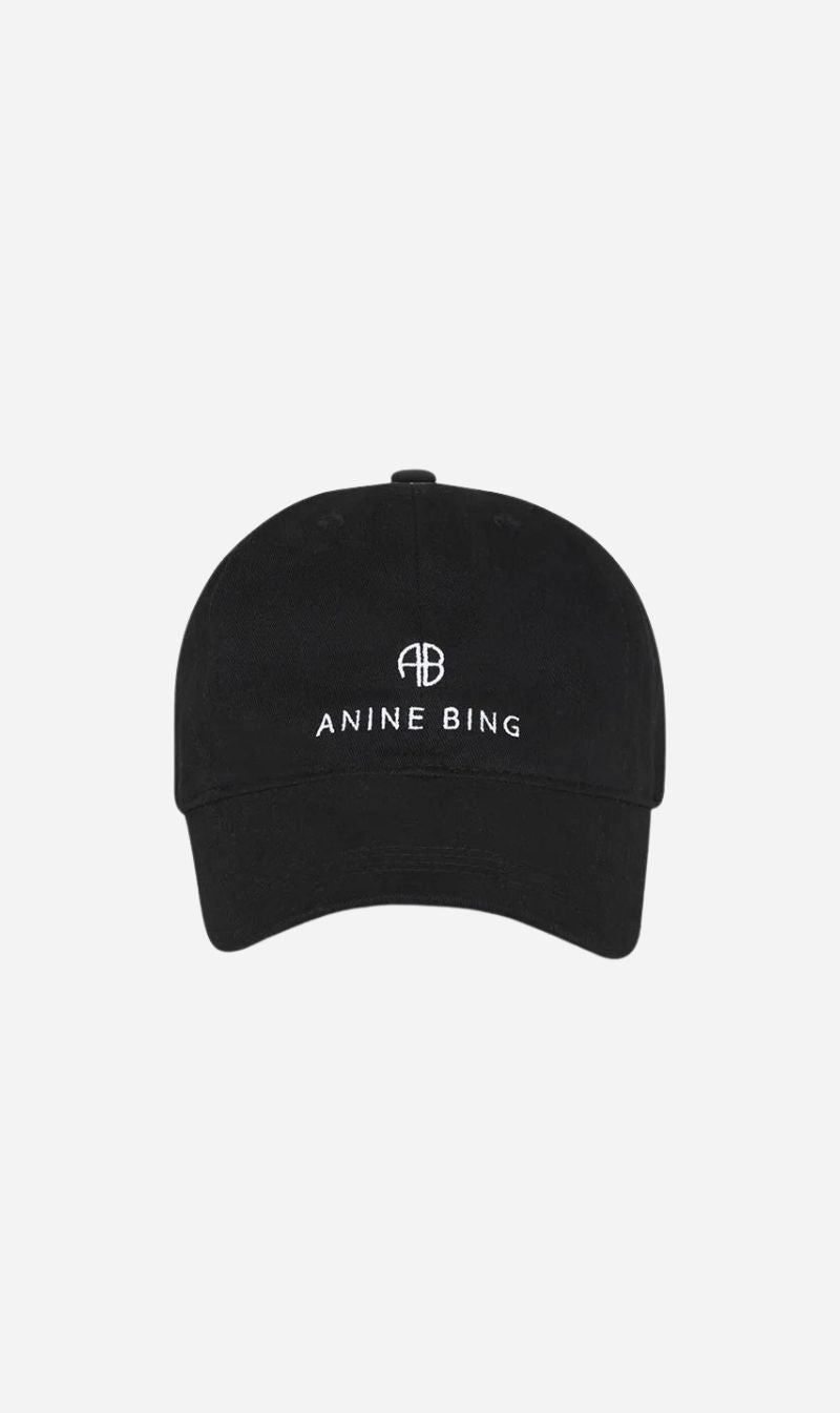 The Jeremy Baseball Cap is a cotton-twill baseball hat in black. It features an adjustable back strap for a close, comfortable fit. An embroidered ANINE BING logo in contrast white stitching at the center front serves as a subtle touch of branding.