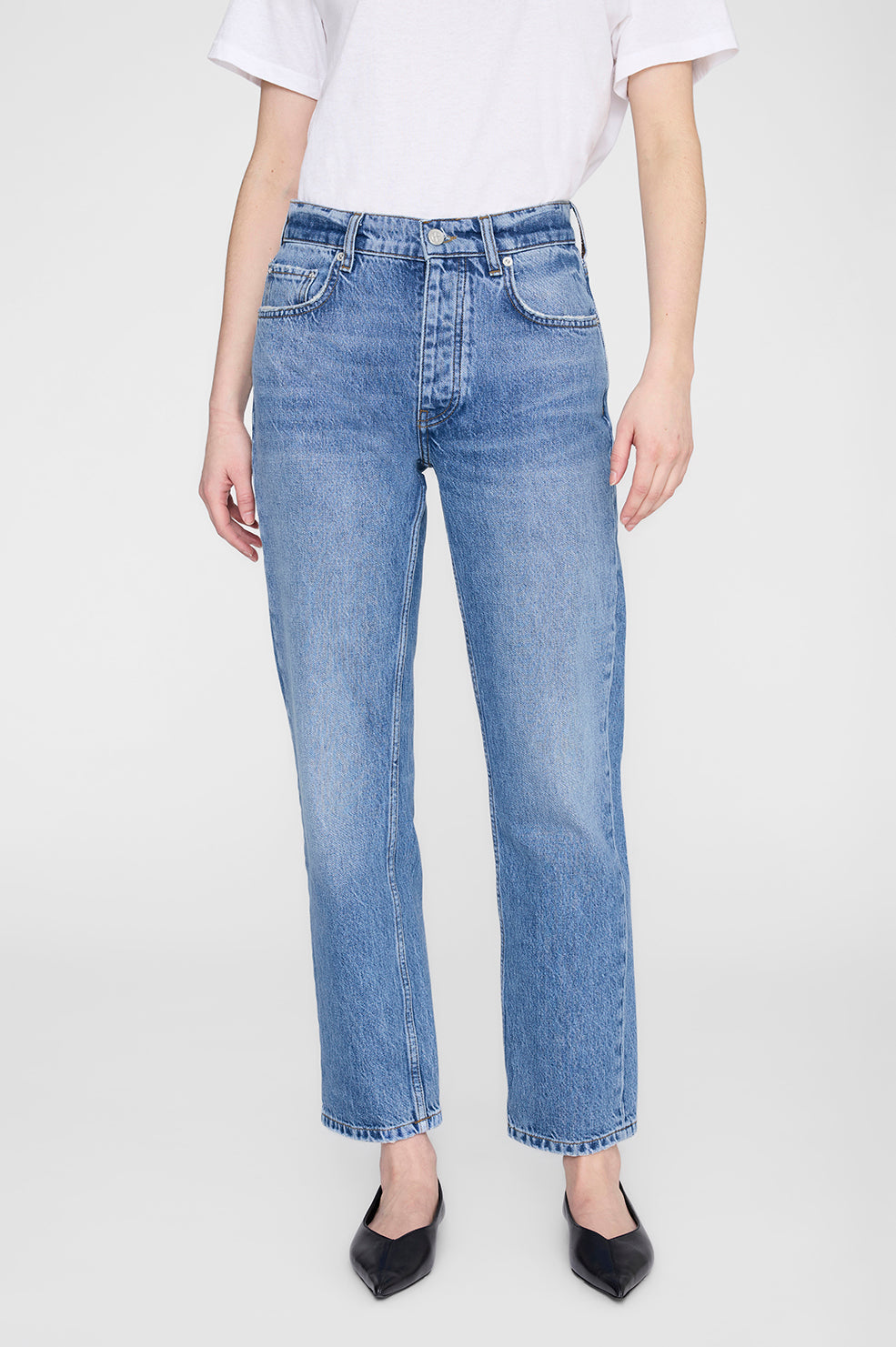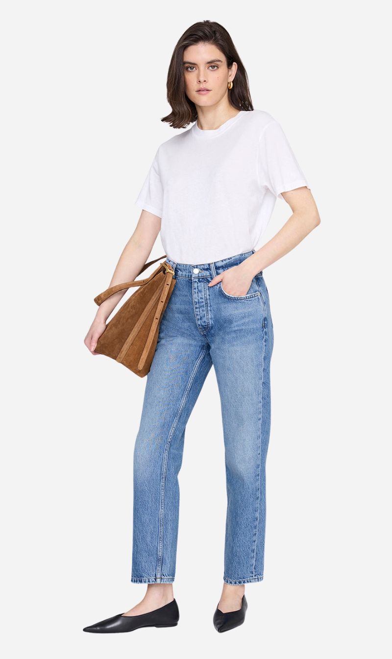 A timeless denim staple reimagined with subtle edge. Crafted from midweight, rigid regenerative cotton denim with an authentic, structured feel that softens over time, the Kate Jean is finished in a tidal blue with vintage-inspired grinding and light abrasion. This straight-leg silhouette offers a perfectly worn-in look while maintaining clean, modern lines. Designed to sit slightly above the hip with an ankle-length inseam, this essential is an effortless everyday style that pairs seamlessly with everything from crisp shirting to relaxed knits.