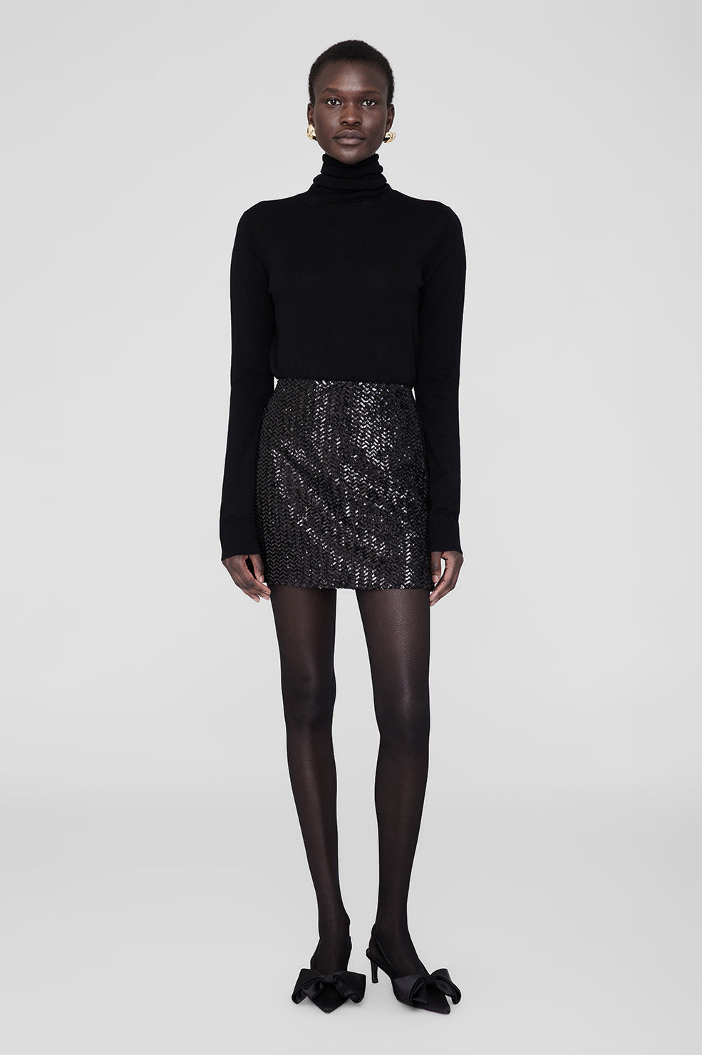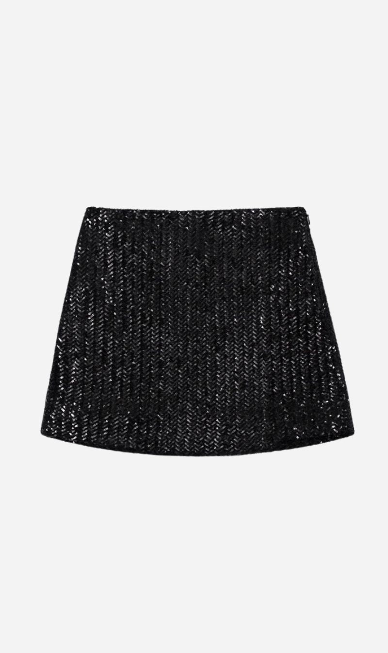 The Tierra Skirt is made from a midweight, sequin herringbone fabrication with shine and texture. This night-out staple is fully lined and features a clean waistband with a side-seam zipper.