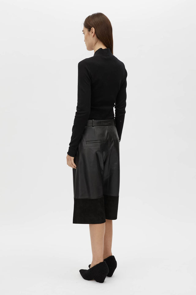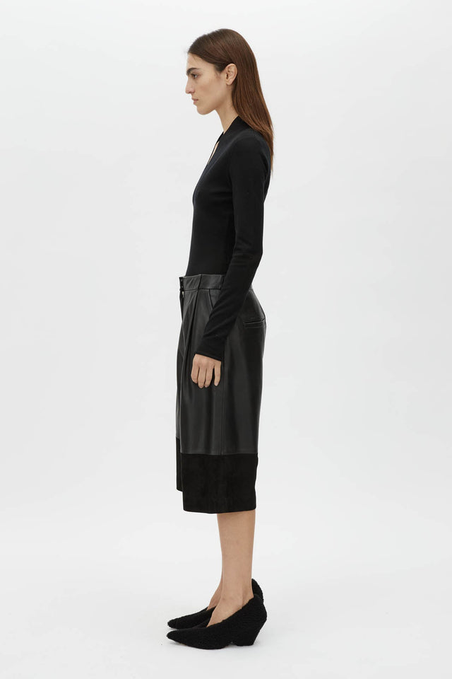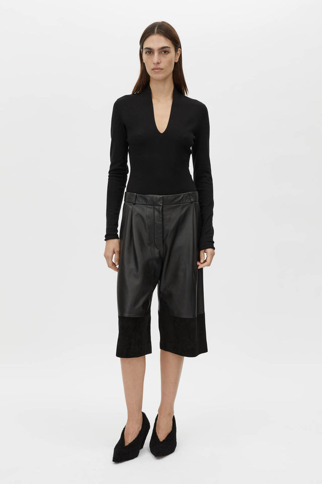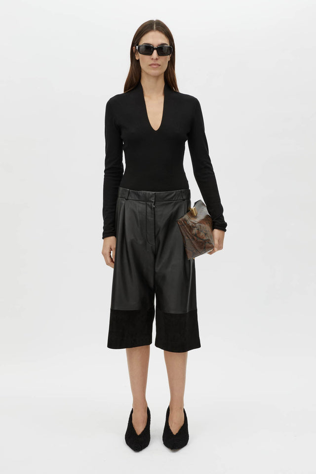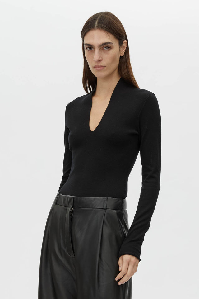 The Ashlar Knit Bodysuit offers a refined and modern silhouette with its long sleeve design and deep V-neck. The grown-on shawl collar and pointelle fashioning along the neckline add a touch of precision to its versatile style. Crafted from a Milano rib body, this bodysuit is a timeless and essential addition to any wardrobe.