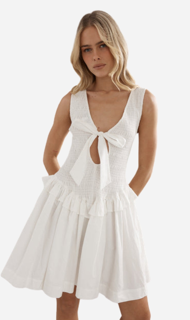 The Younger Sister to the Elsa Dress - flirty, feminine, and full of charm. The Cindy Lou Mini is your new go-to for festive days and late summer nights. Featuring a beautifully shirred bodice that hugs in all the right places, this mini is designed with a flattering V neckline and a soft bow tie that can be styled at the front or back for a versatile finish. Easy to wear, hard to forget.