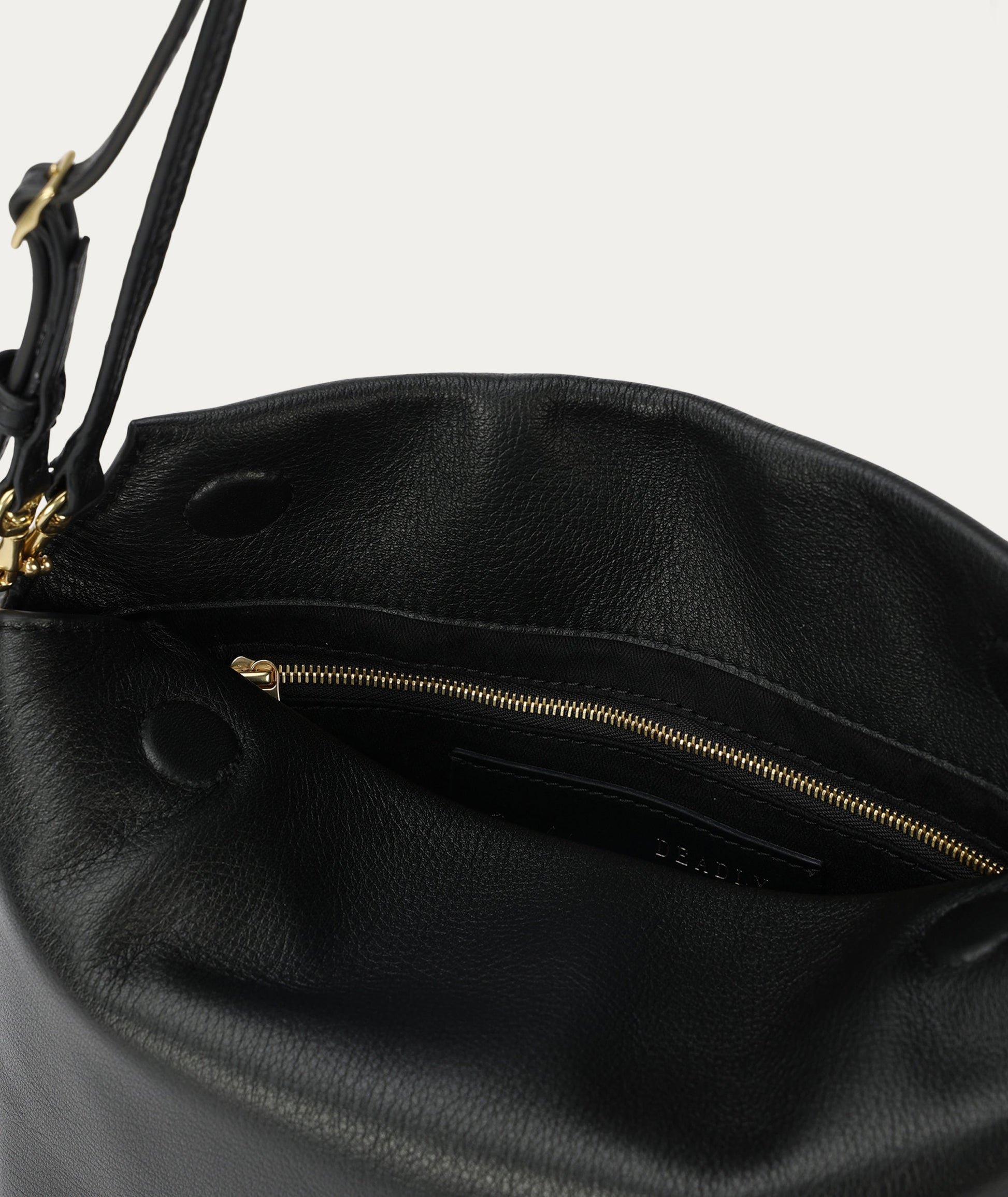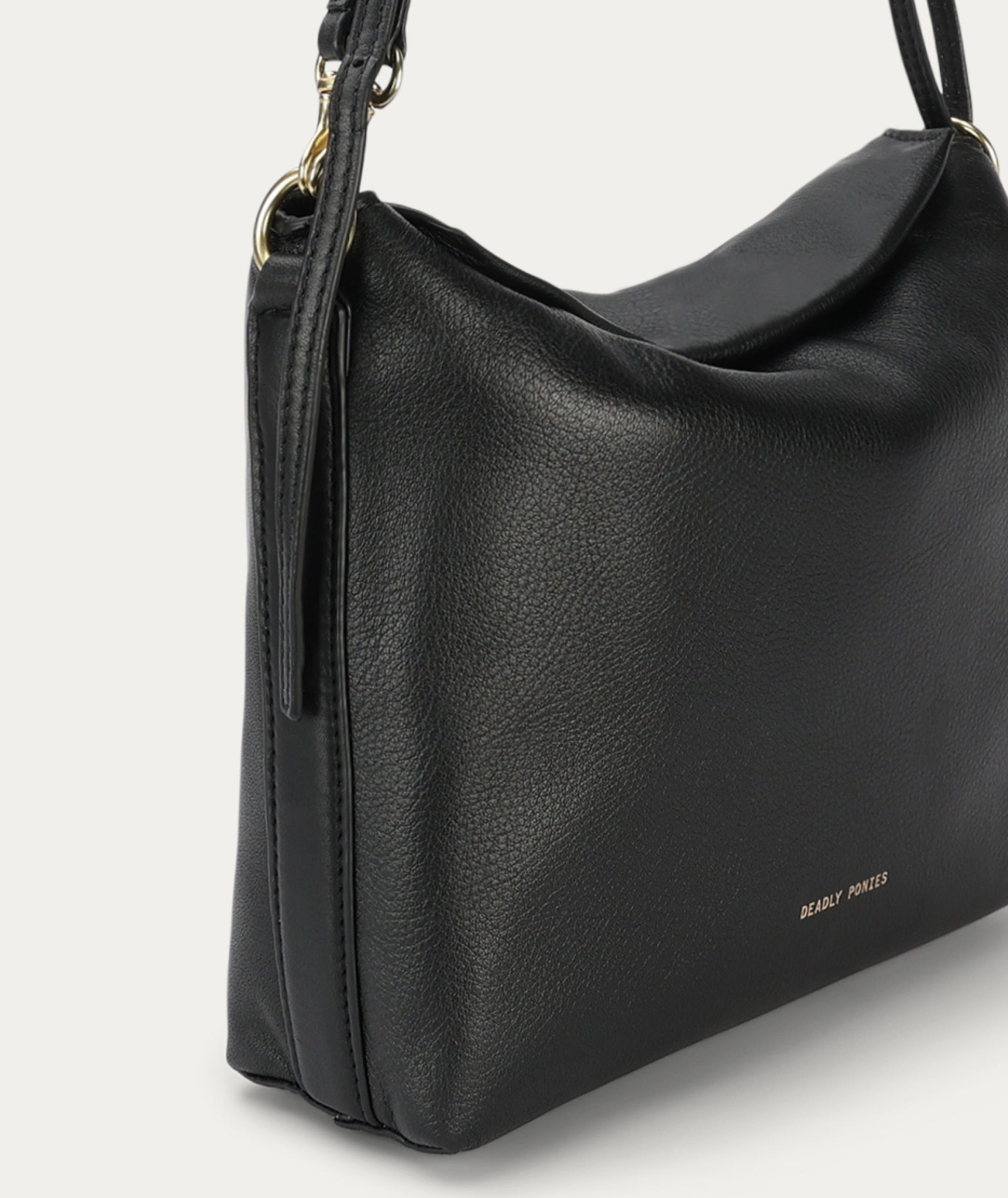 Mr. Piper, Deadly Ponies' midi crossbody bag handcrafted with buttery Calf Nappa in Black. His fixed adjustable strap makes for ease of wear - on your shoulder, or hands-free as a crossbody. Meanwhile, his magnetic flap closure houses two internal slip pockets and an internal zip pocket.