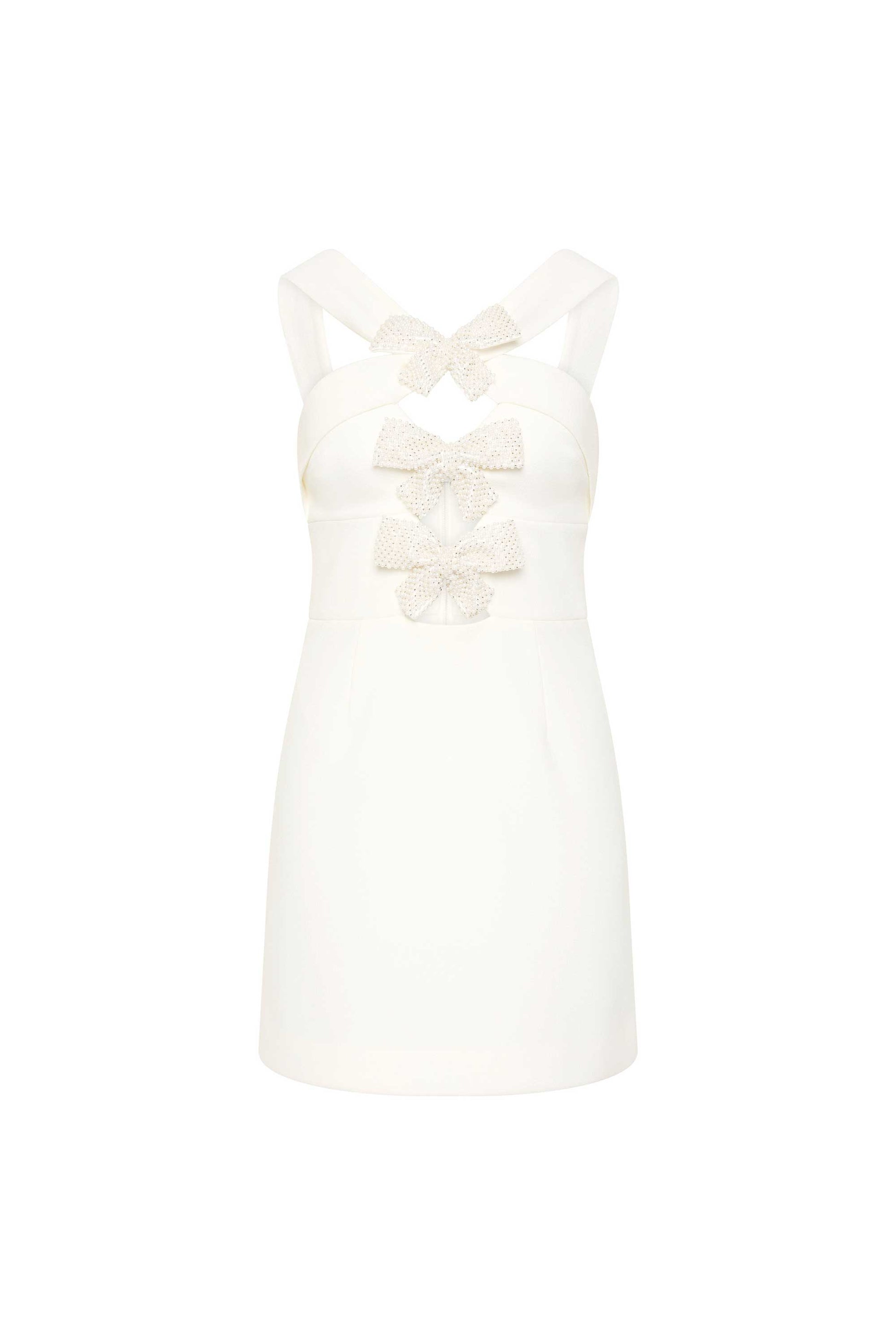 The Hermoine Mini Dress in ivory radiates glamour and modern elegance. Tailored from bonded crepe, it features a beautiful halter neckline and a fitted bodice, adorned with front cut outs and pearl embellished bows. The cinched waist flows into a chic A line mini skirt, creating a flattering silhouette, while a back zip fastening ensures a secure fit. Complete with lining, this dress is an ideal choice for brides-to-be for a variety of wedding celebrations events.