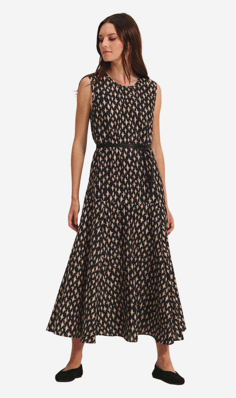 Featuring delicate beaded detailing along the neckline and armholes, this dress adds an elevated touch to any occasion. Crafted from printed silk cotton voile, it includes a detachable faux leather belt and slip for customizable styling, finished with a double-button keyhole closure at the back.