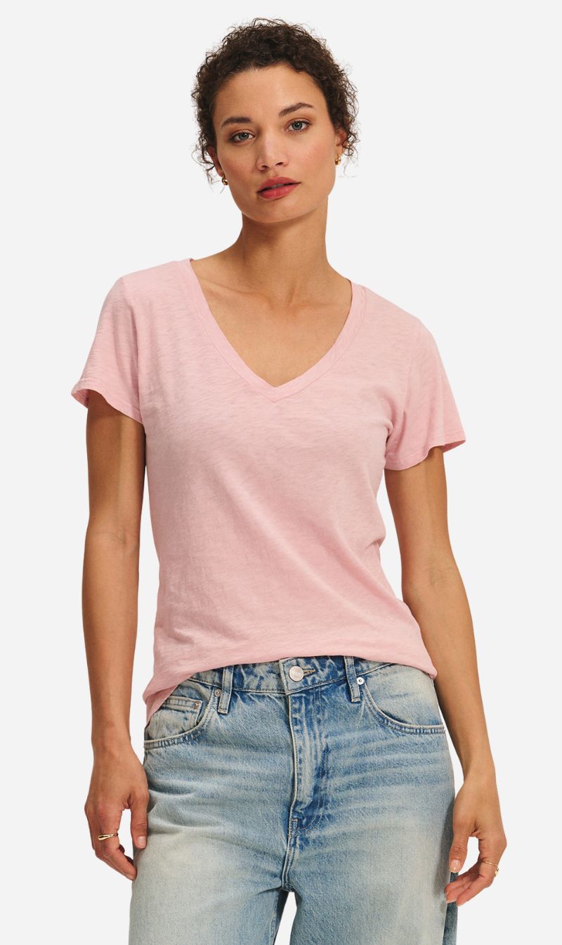 This V-neck tee will be on heavy rotation. Made from luxurious cotton slub, it offers exceptional softness, easy care, and a flattering fit. With short sleeves and a banded neckline, this tee is a versatile addition to your wardrobe.