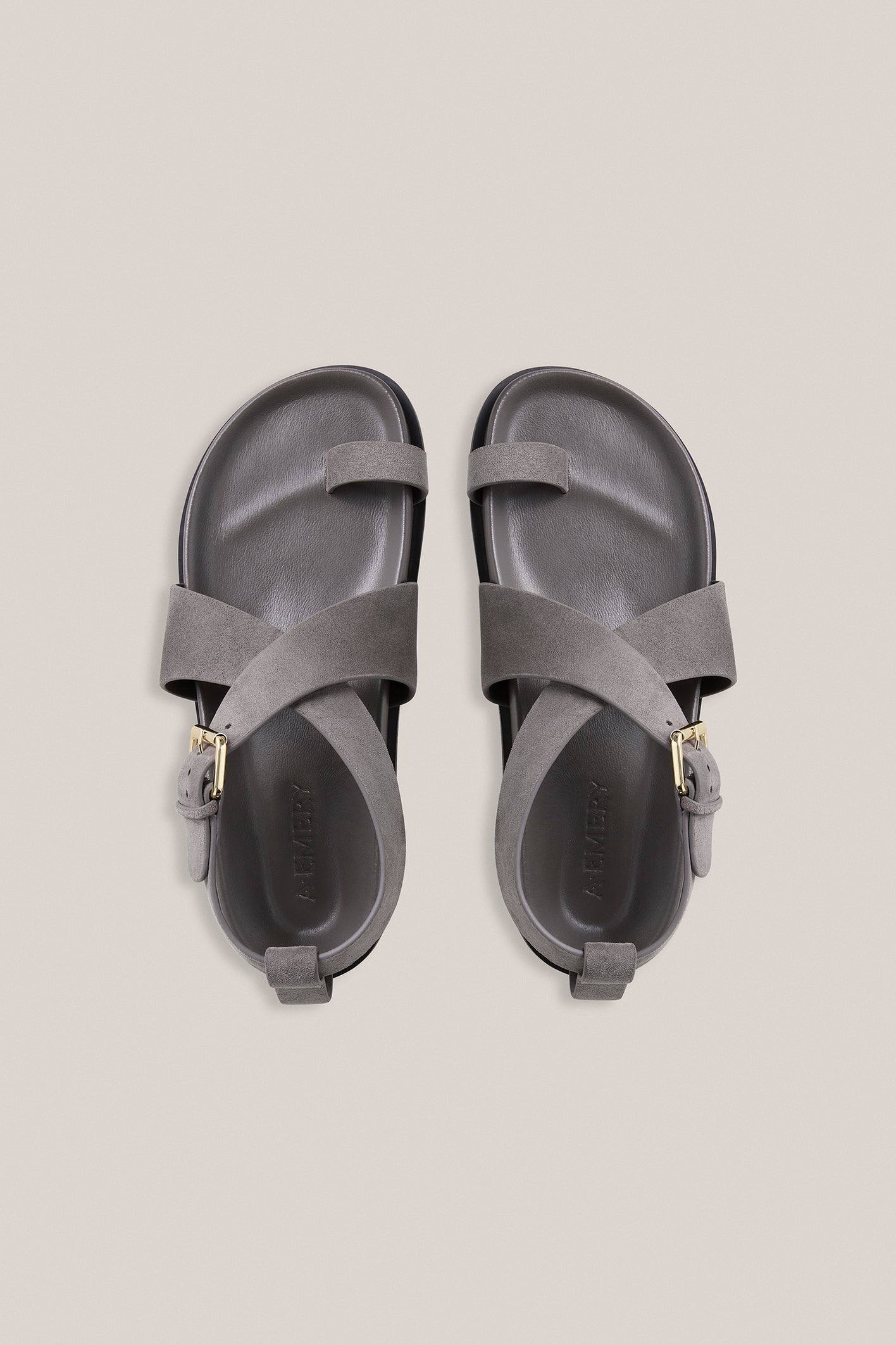 The Dula sandal sits atop a moulded footbed, featuring a toe hold and two criss-cross straps that encase the foot before wrapping around the ankle and finishing with a soft gold buckle.