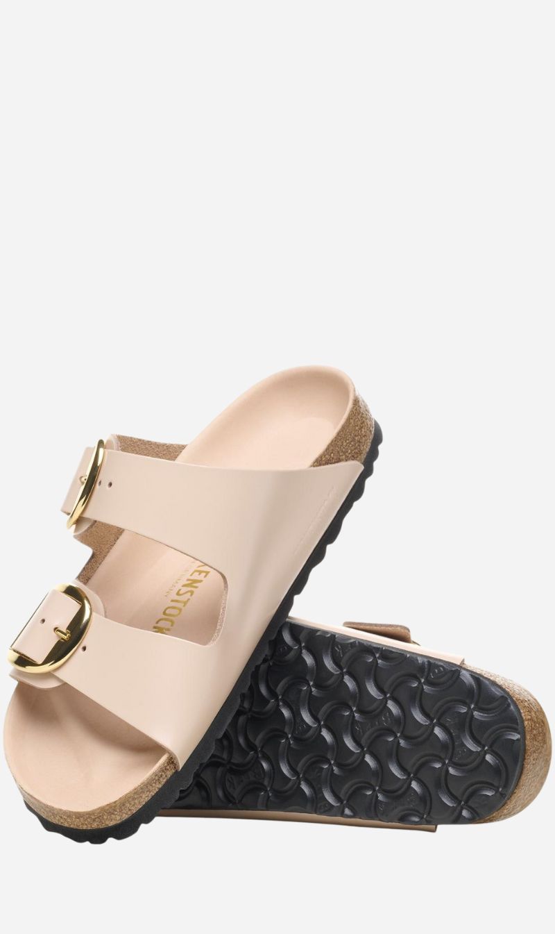 The legendary two-strap design from BIRKENSTOCK with amplified buckle accent - the Arizona Big Buckle. The Big Buckle version features a large, elegant buckle creating a bold yet minimalist design. The semi-exquisite footbed is fully lined with soft piumato leather, making it exceptionally comfortable. The upper is made from high-quality natural leather with a high shine finish.