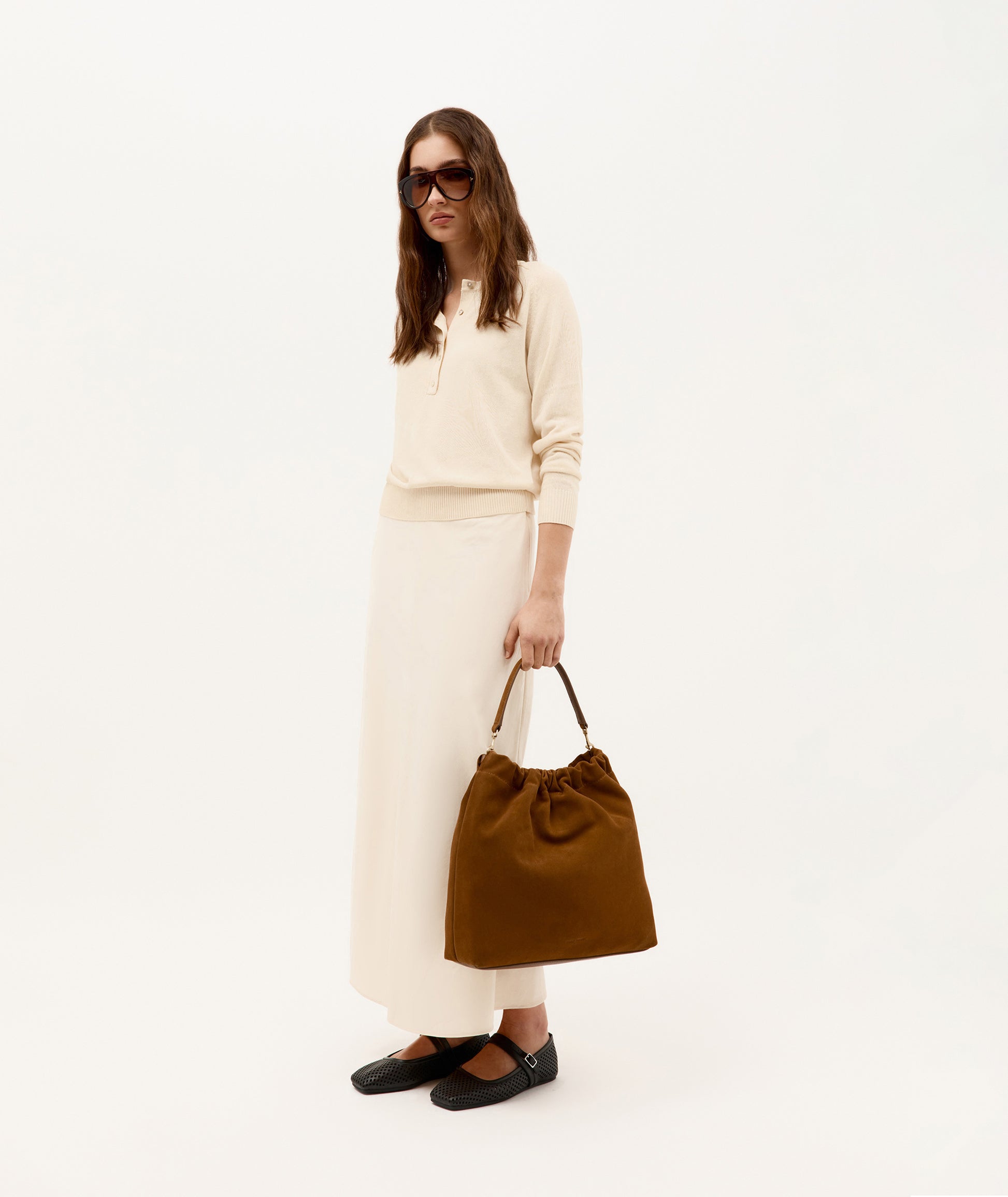 Calf Suede trimmed with Calf Nappa, REACH Certified Cotton Lining, Brass Hardware.