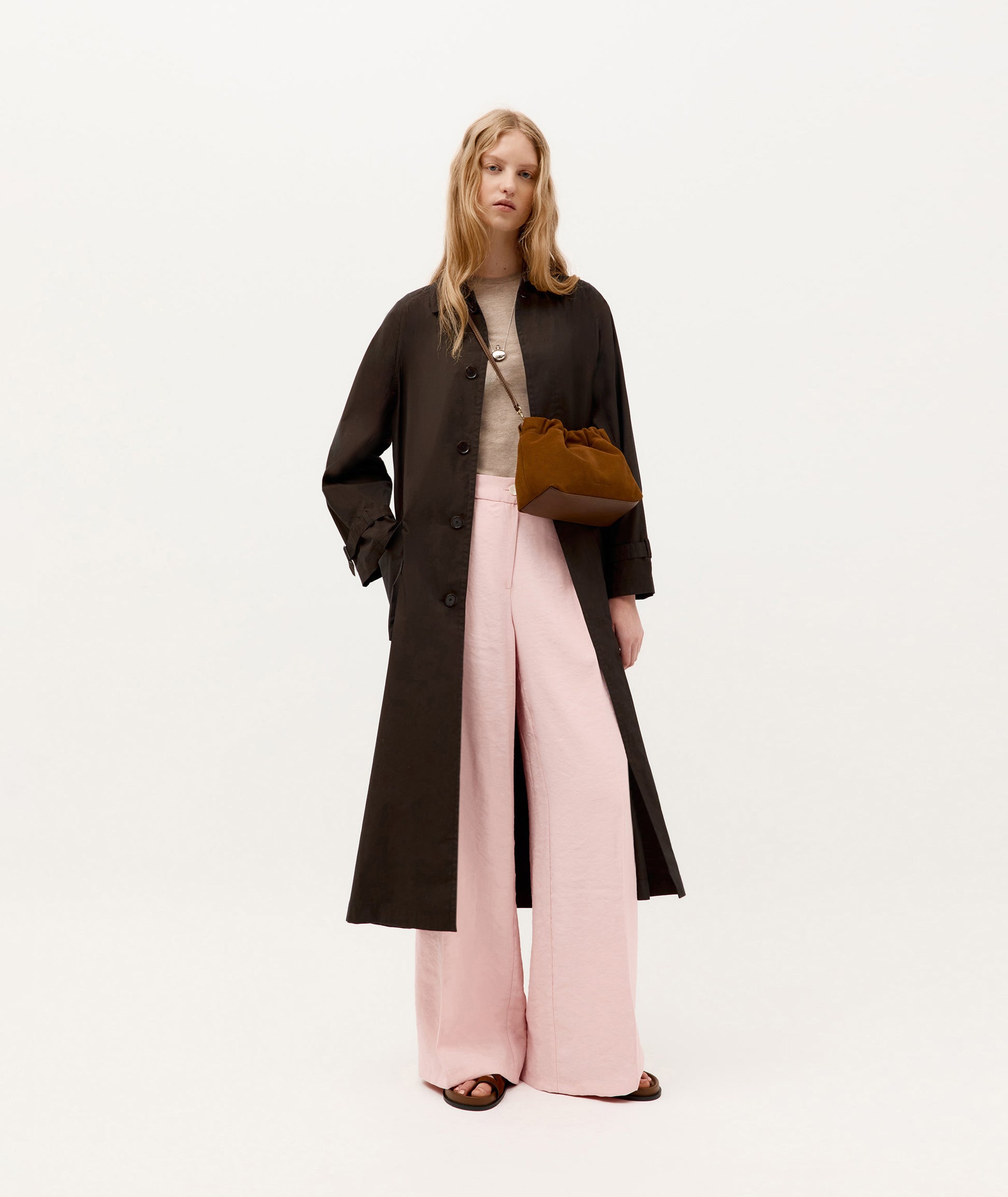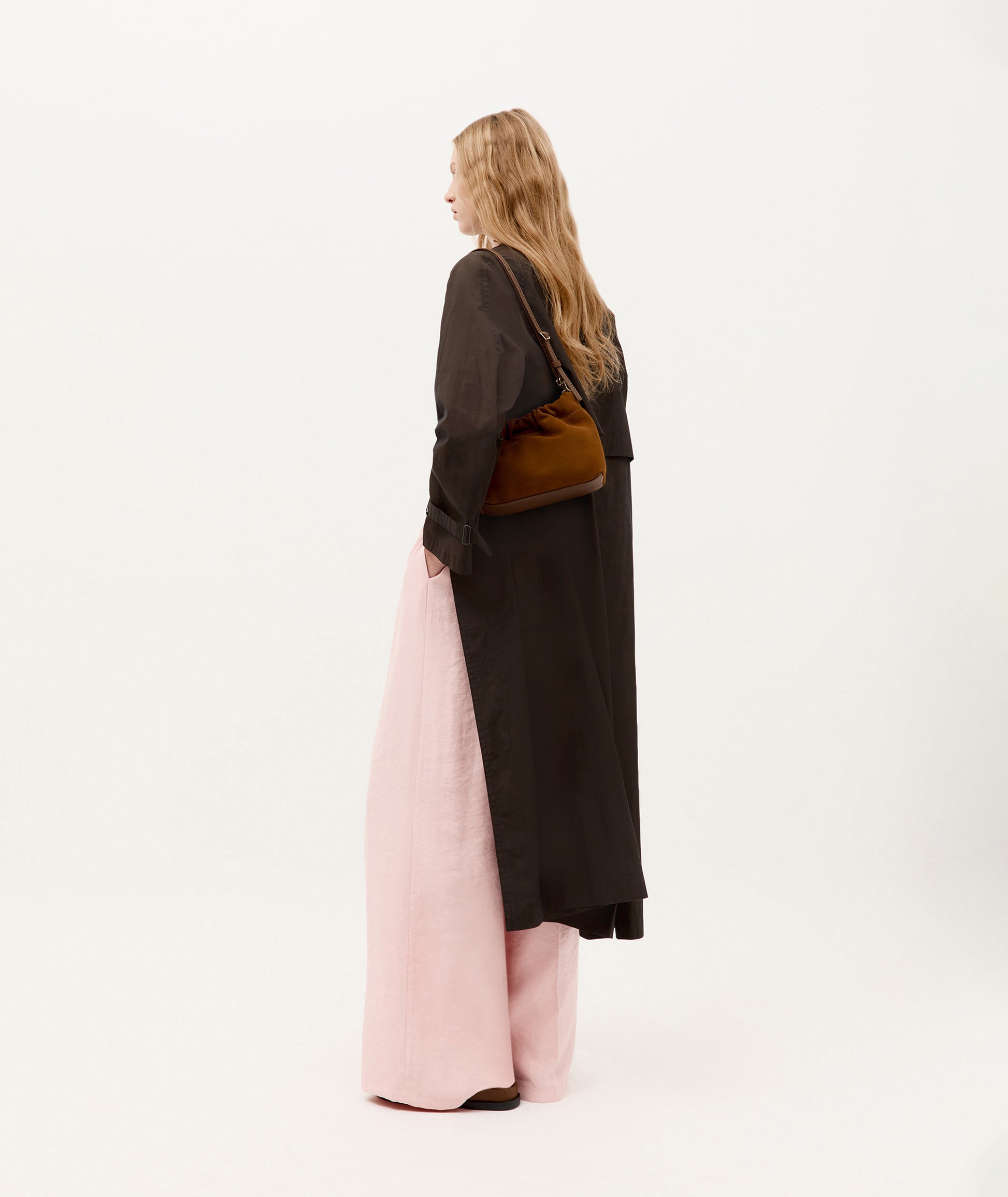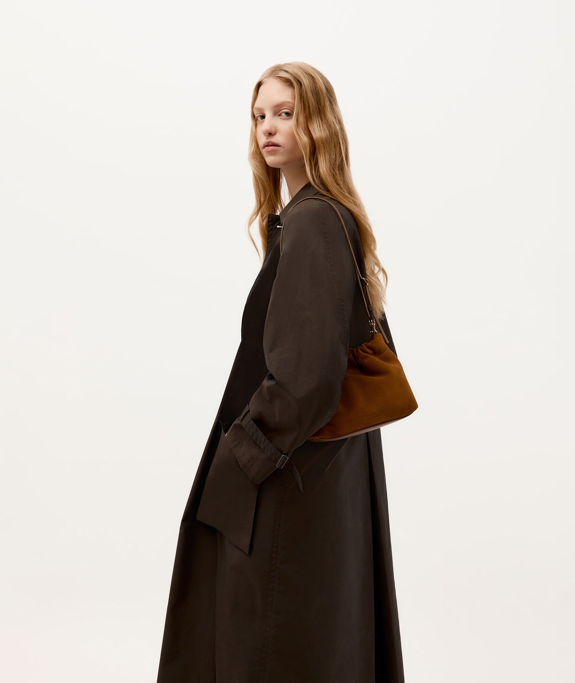 Mr Cinch Mini features a softly curved silhouette with distinctive cinched detailing. Crafted from velvety Gingerbread Calf Suede, he includes an internal slip pocket, magnetic closure, and a detachable, adjustable leather strap.