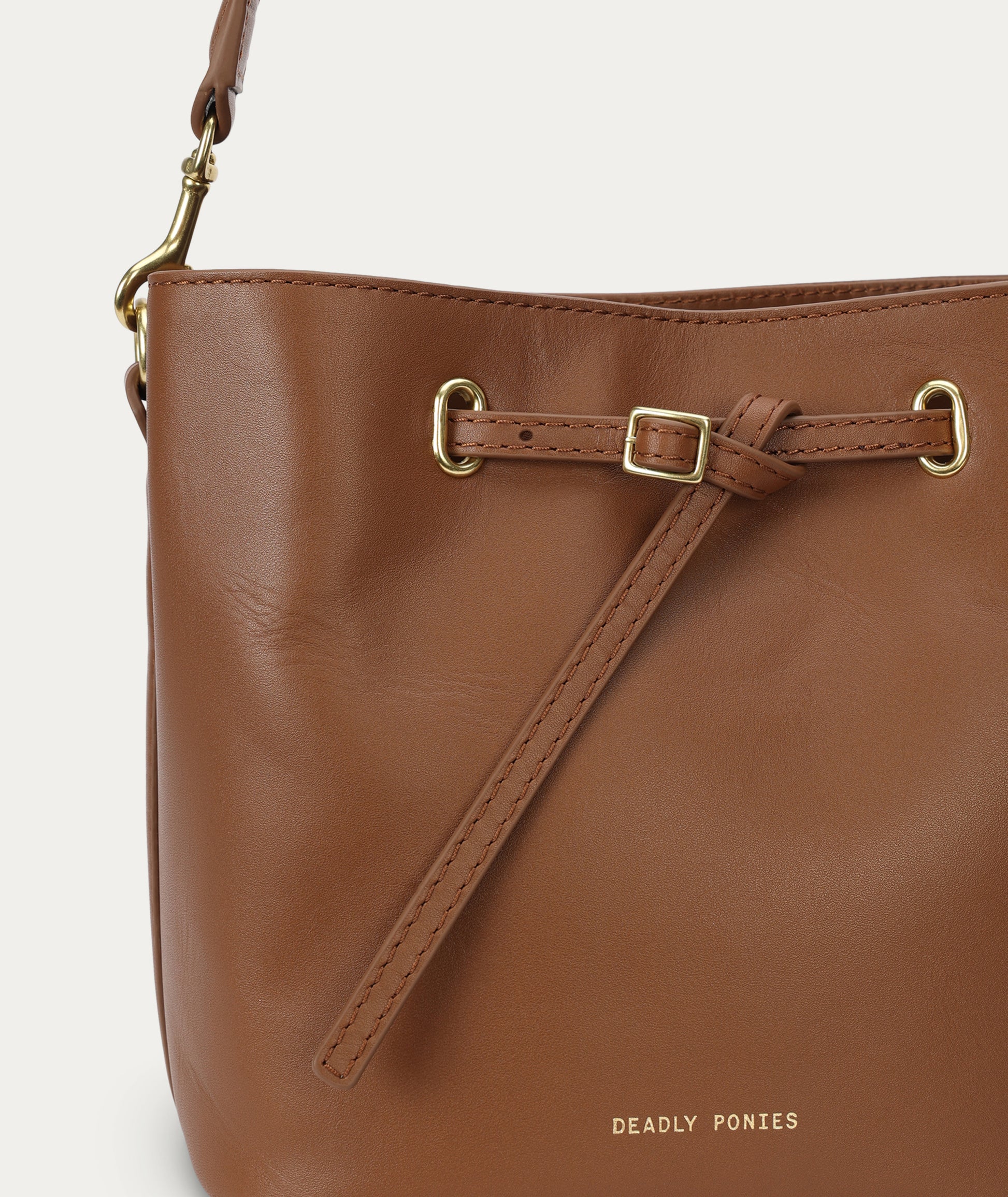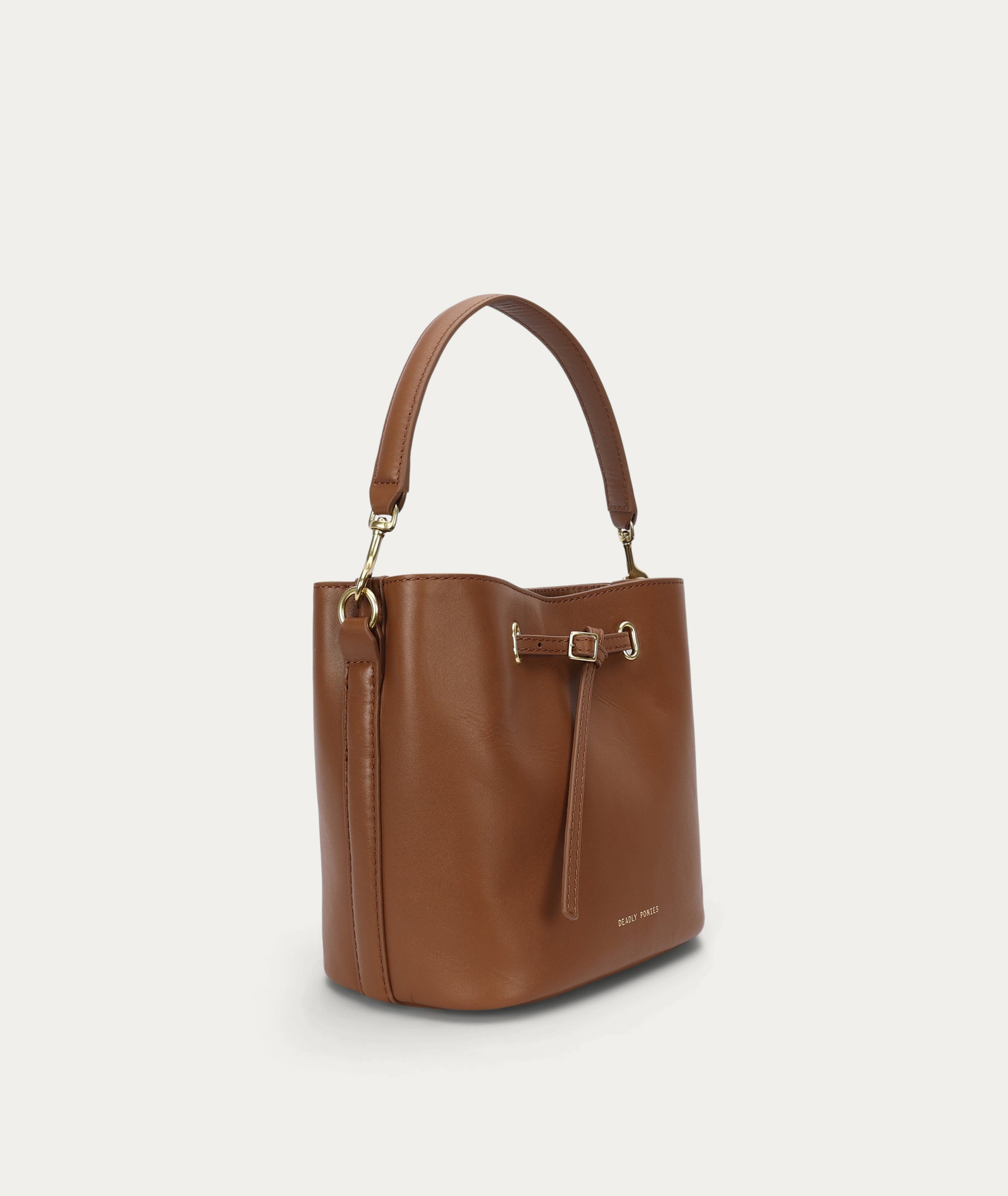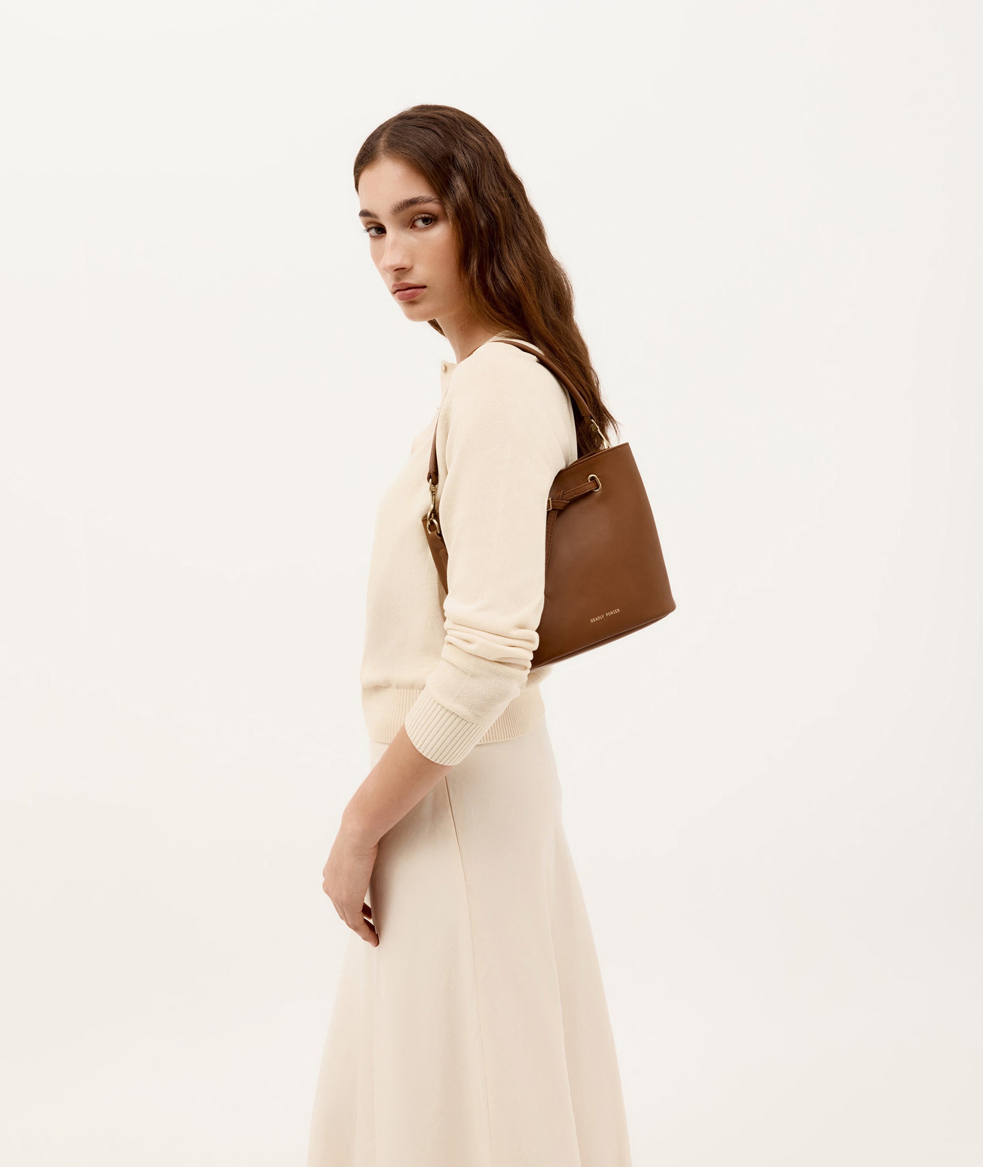 Mr Penny in Driftwood reimagines the classic bucket bag in Ironed Calf Nappa, finished with solid brass hardware. He features leather detailing threaded through brass eyelets, a detachable top handle, an adjustable strap, and a removable cotton pouch.