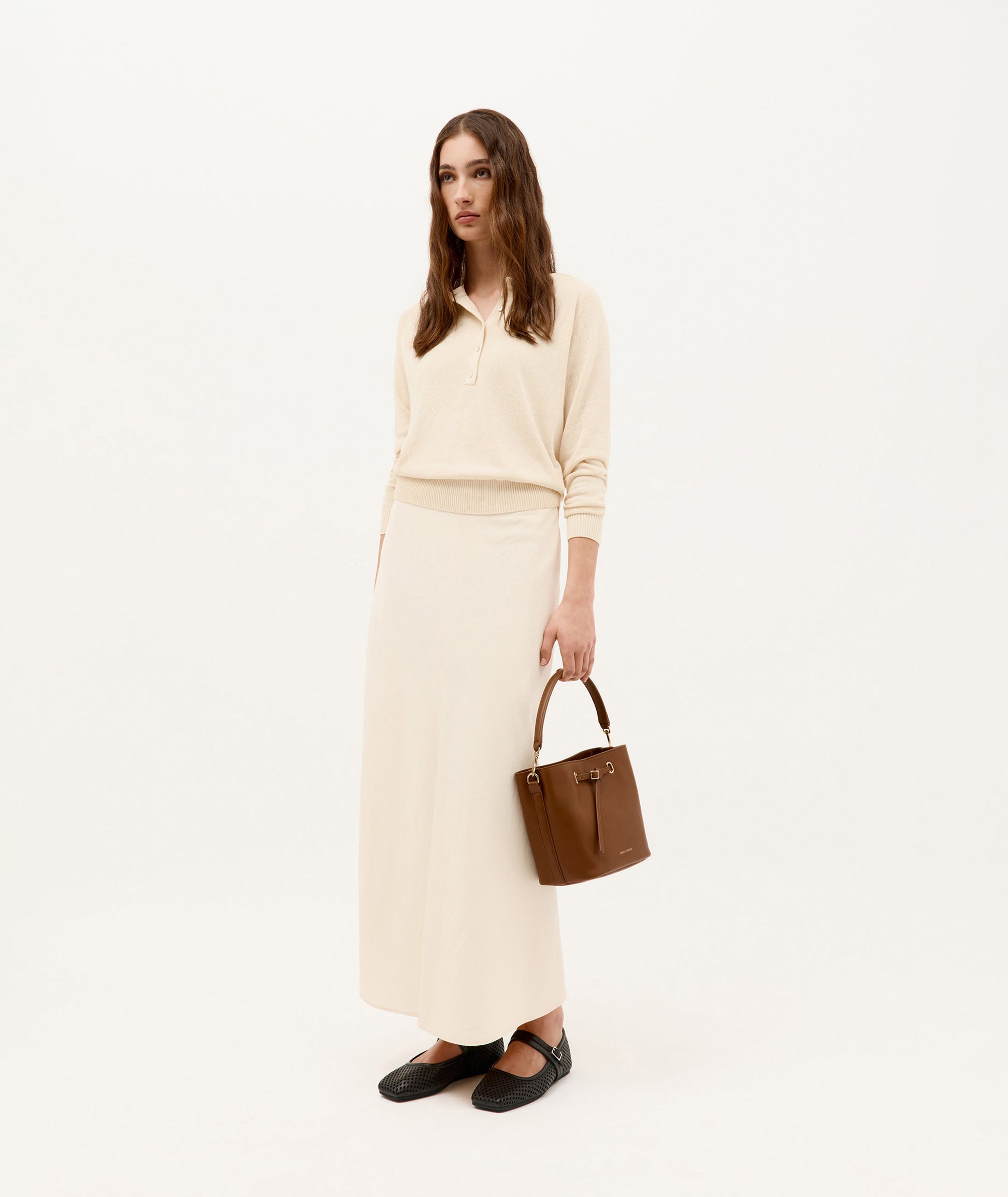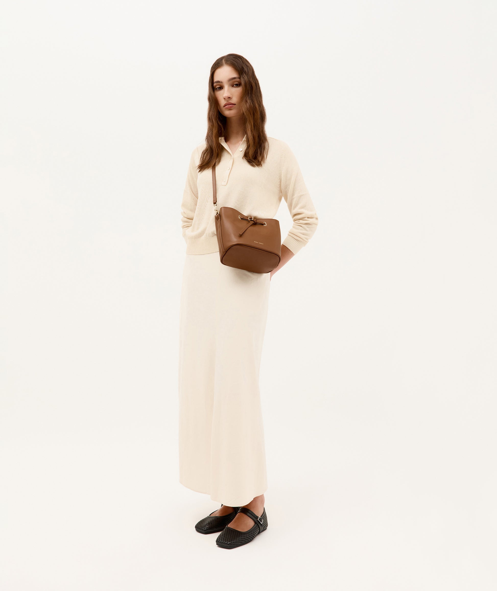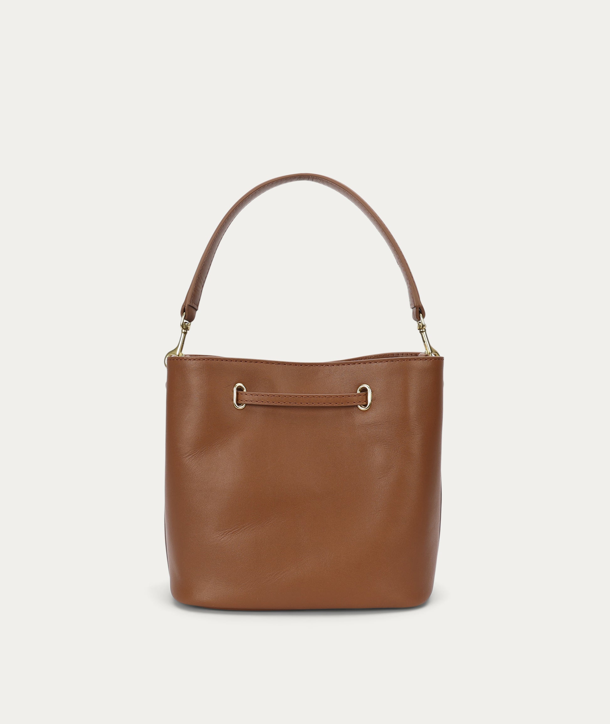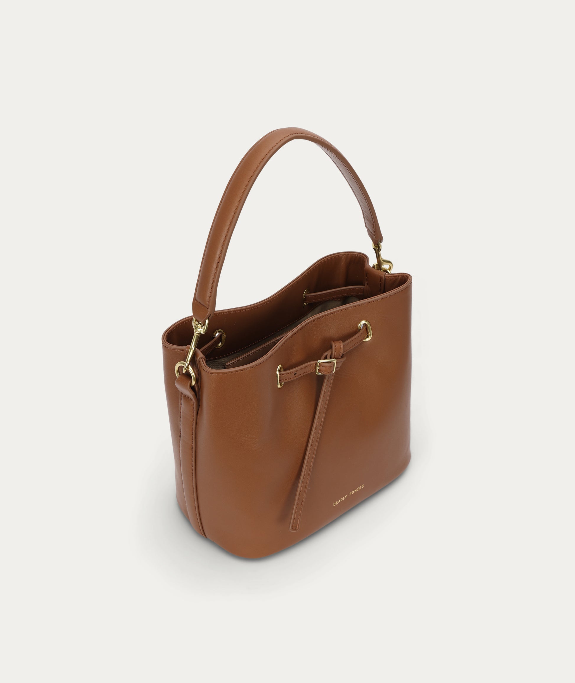 Mr Penny in Driftwood reimagines the classic bucket bag in Ironed Calf Nappa, finished with solid brass hardware. He features leather detailing threaded through brass eyelets, a detachable top handle, an adjustable strap, and a removable cotton pouch.
