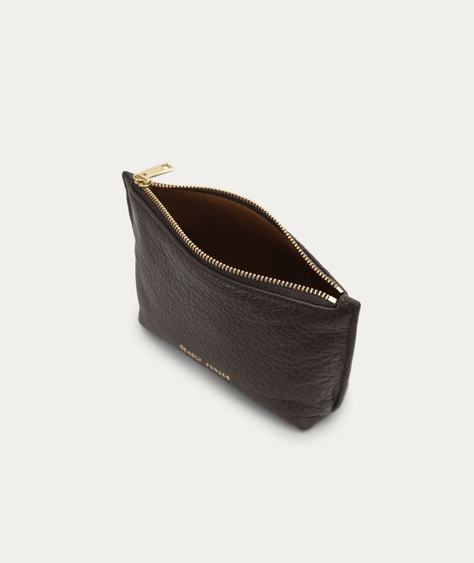The Deadly Ponies Poucher in Java is crafted from supple Calf Nappa with Calf Suede interior, and features a zip closure with solid brass hardware.