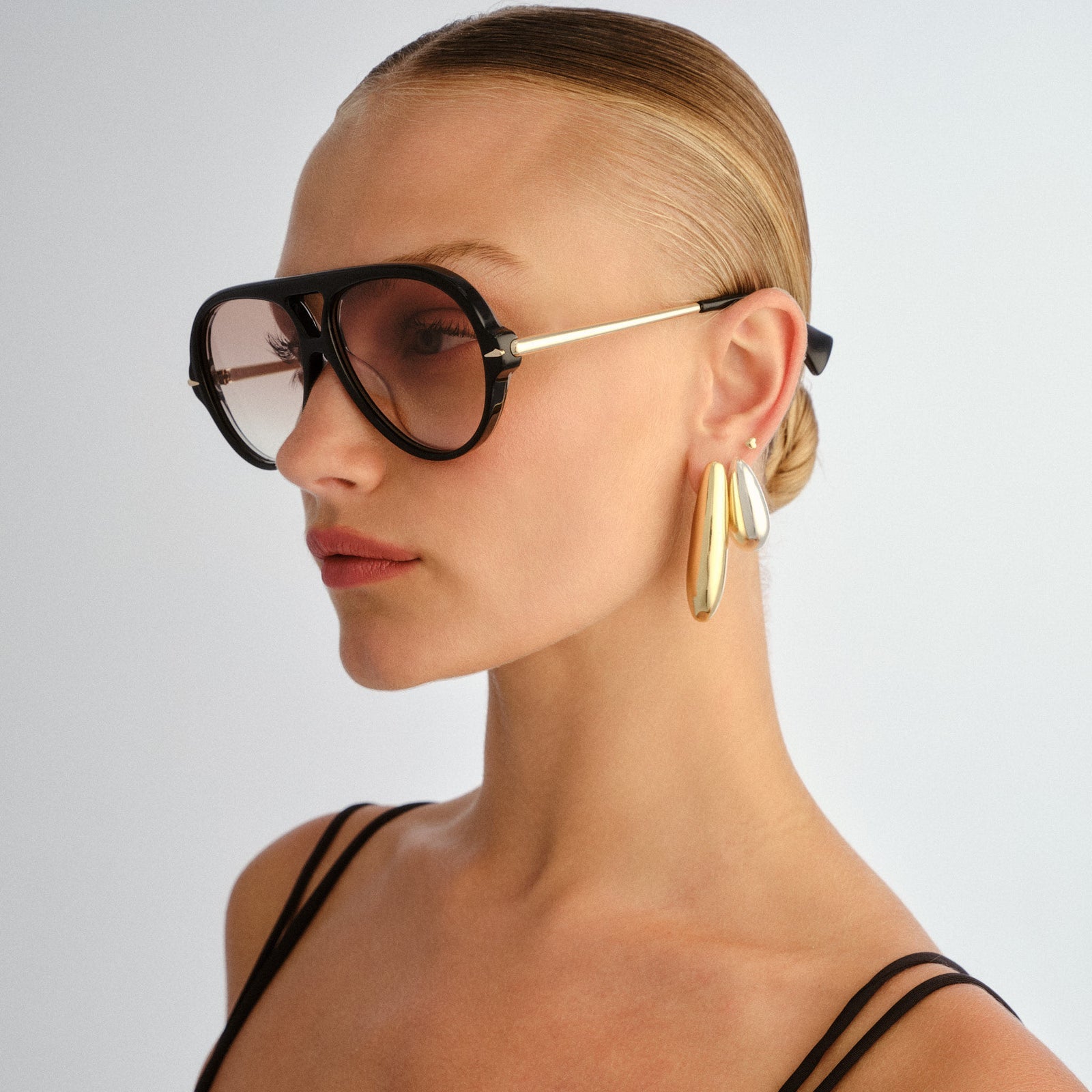 These modern aviators combine sculptural form with soft curves, featuring a distinctive cut-out bridge and gently rounded lenses. Crafted from bespoke 8mm & 6mm acetates with chamfered detailing, the obsidian black frame exudes luxury, while elongated metal temples with signature claw profiles add a bold, refined touch. Fitted with premium CR-39 lenses, they provide superior optical clarity and 100% UVA/UVB protection.