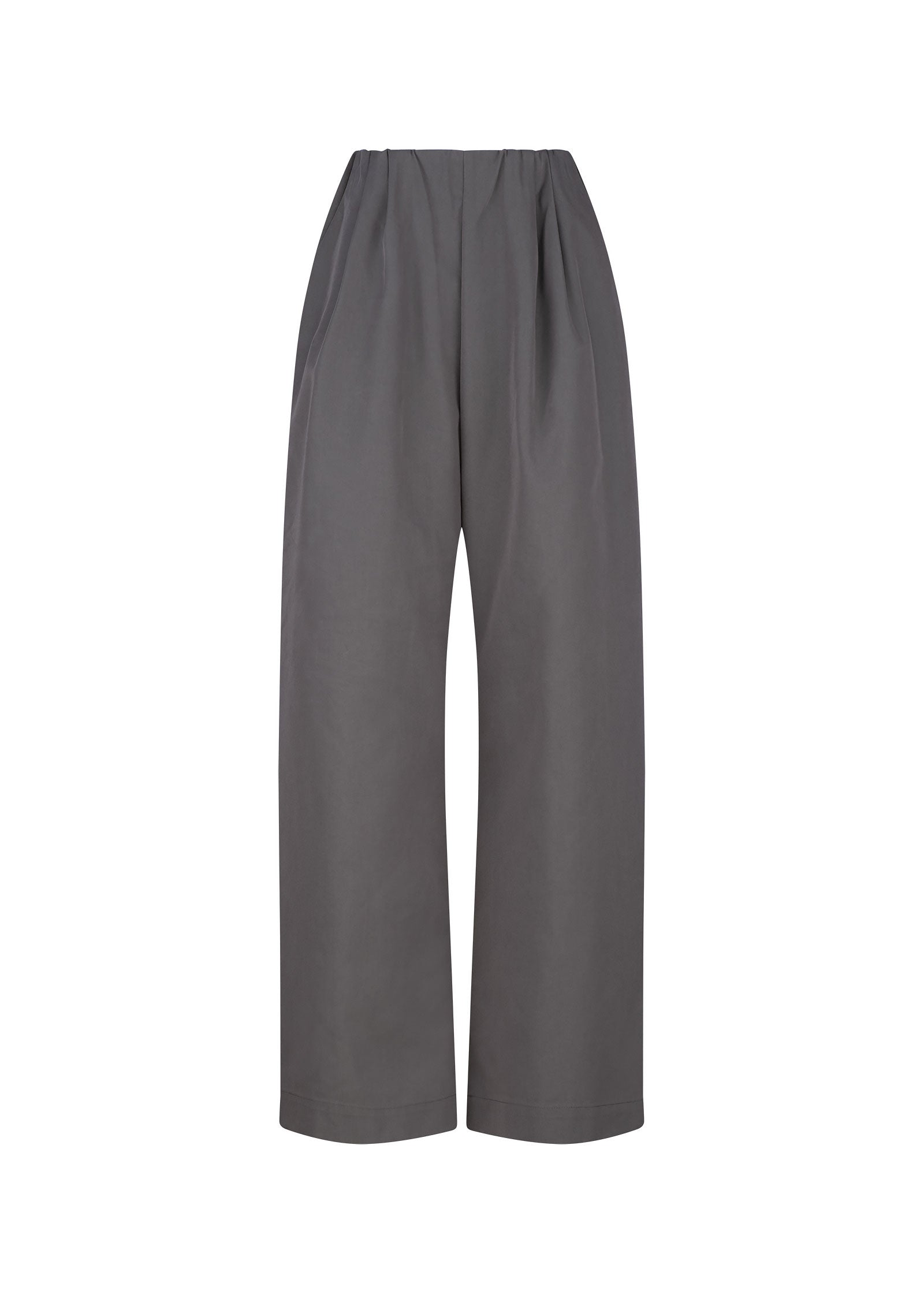 A relaxed pant with feature tuck and gathered waist detail with internal elastication cut in a structured cotton drill.