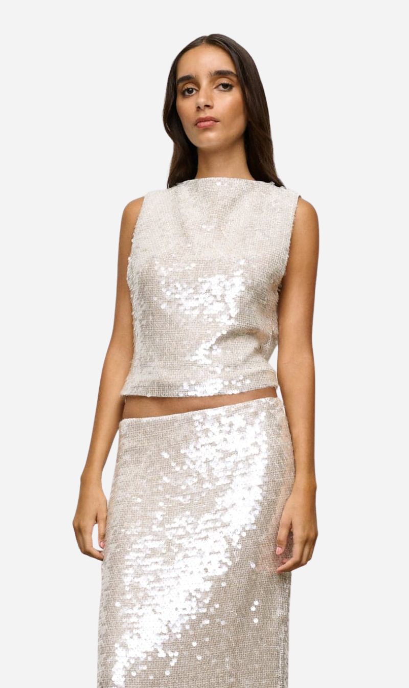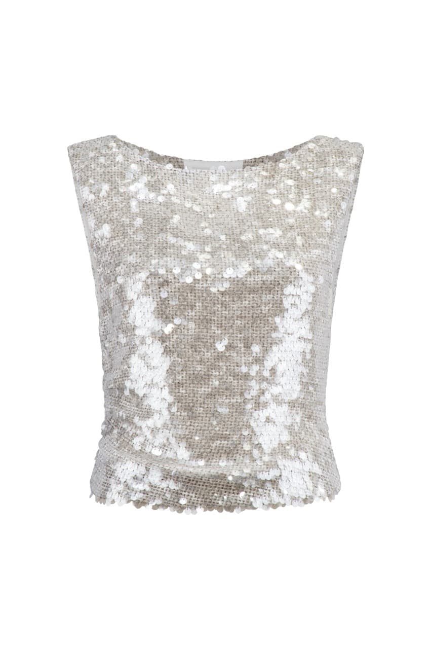 A relaxed, sleeveless top with boat neck and waist tucks crafted in a custom sequin fabrication.