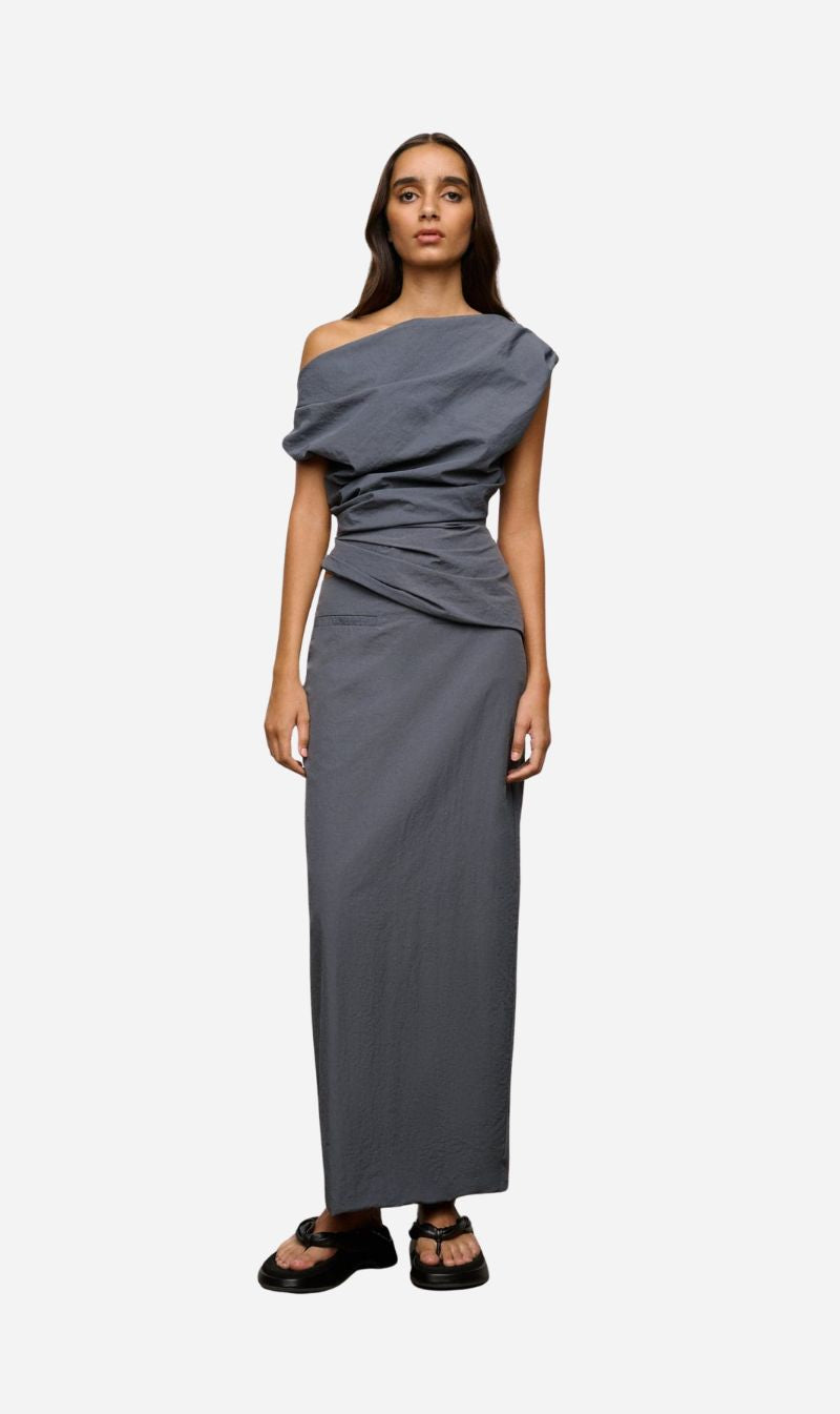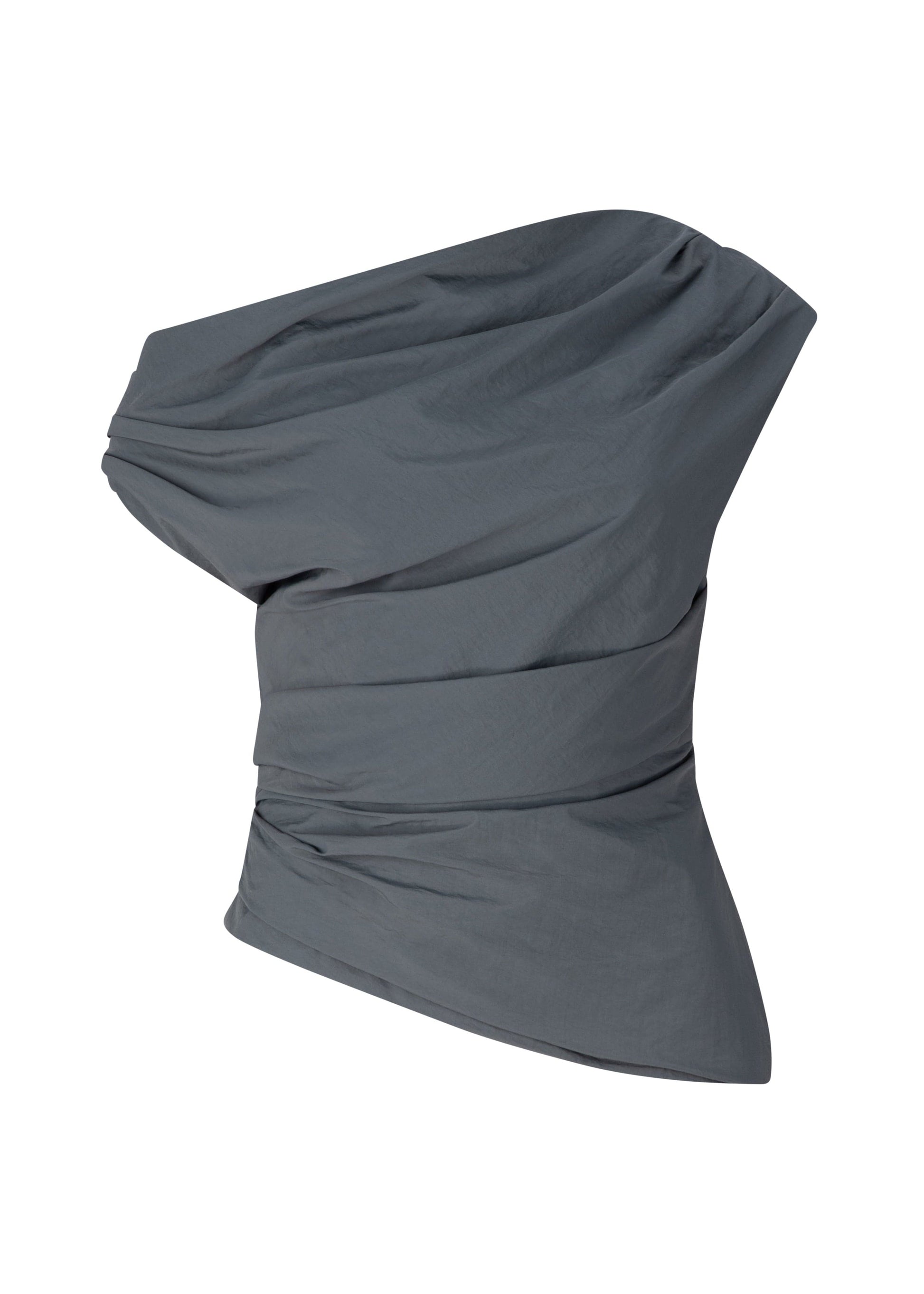 A draped, off shoulder top with tuck detail in our signature lightweight nylon with soft drape.
