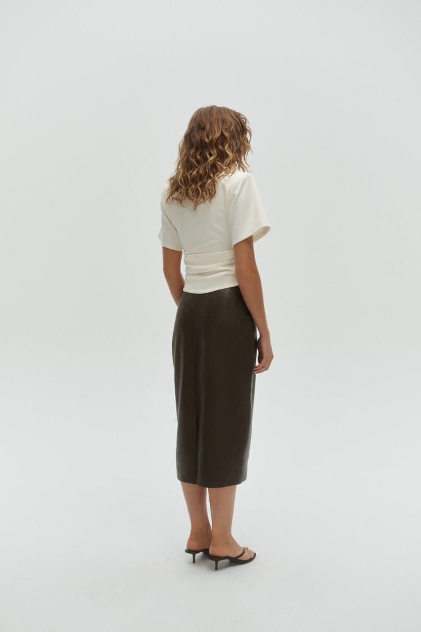 This short sleeve tee features a tucked silhouette with removable shoulder pads for a sculpted, structured look. Crafted in luxurious brushed ponte, it offers a smooth, elevated fit that works seamlessly from tailored outfits to casual styling.