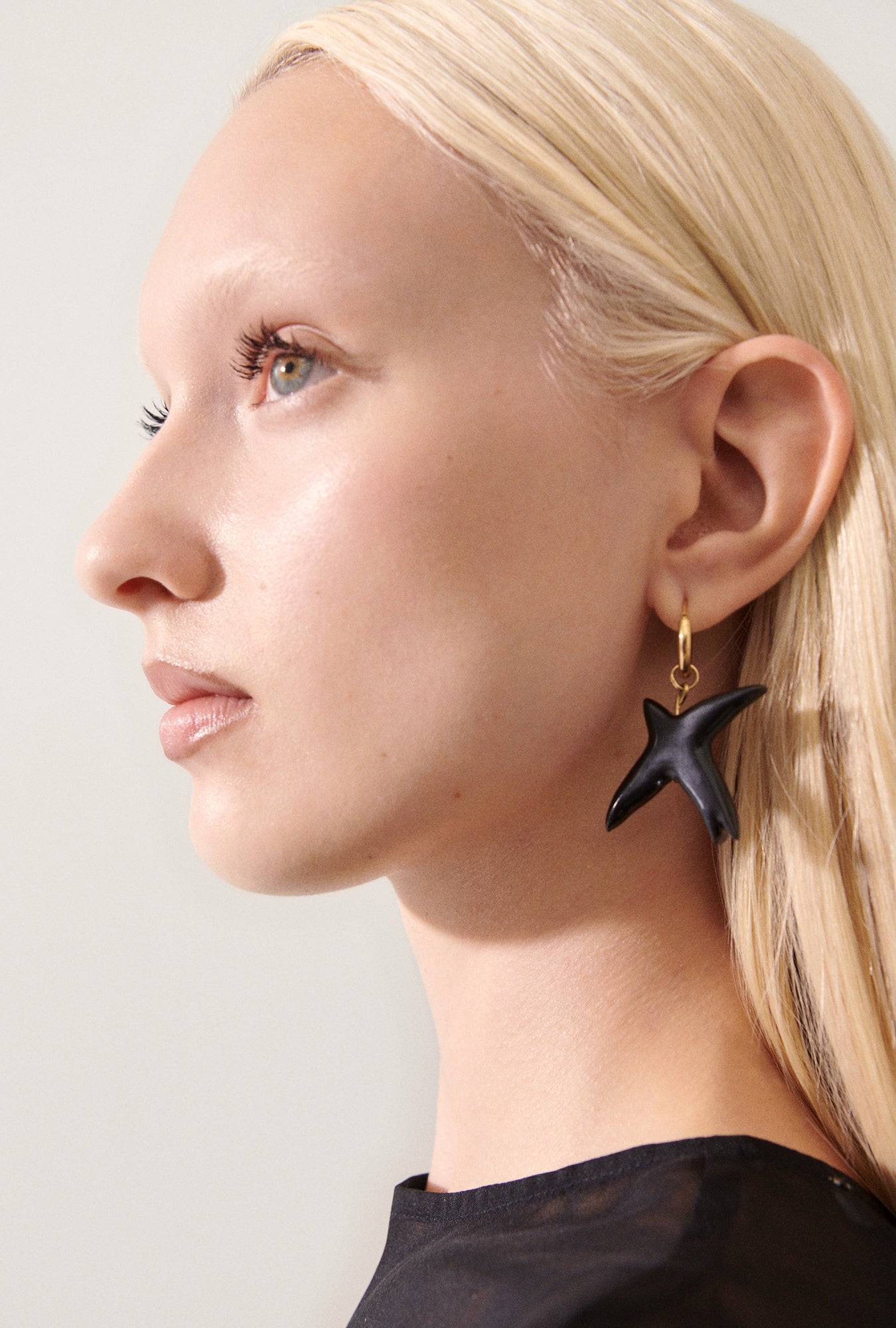 Silk Laundry feather dress, crafted from 100% silk chiffon, with a feather appliqué. Designed with a sheer, bias-cut silhouette, it features a round neckline with a covered button at the back neck opening.
