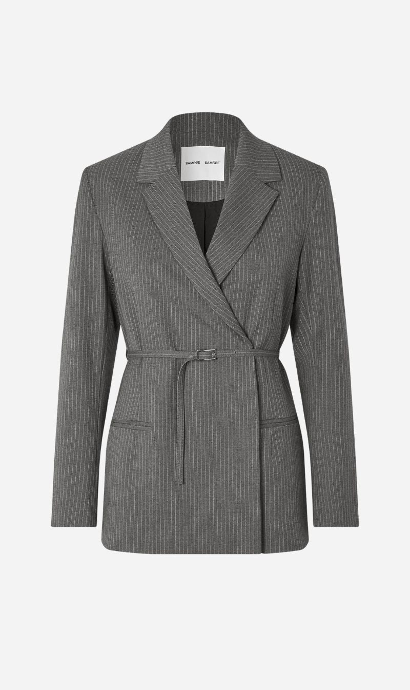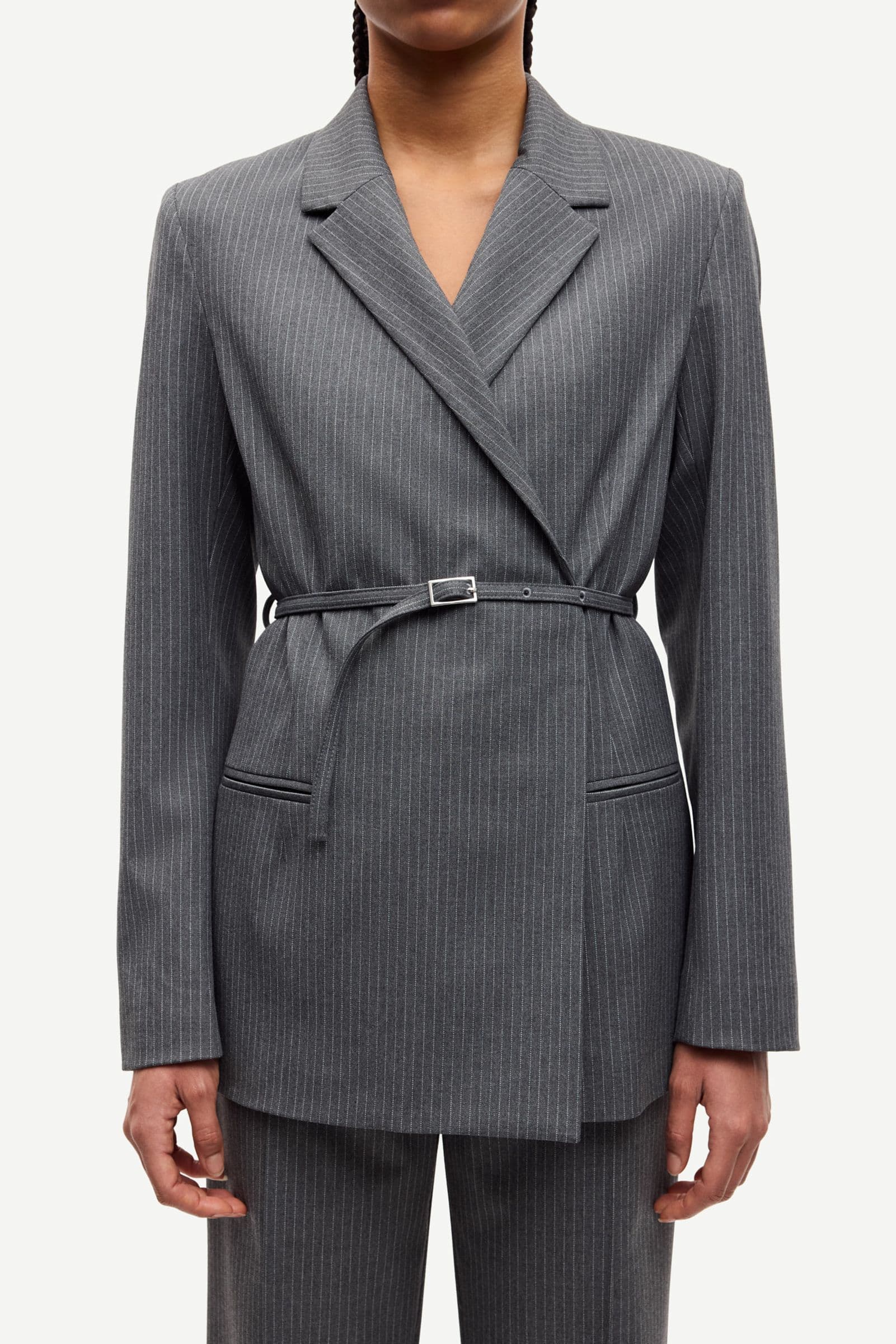 Pinstripe blazer with a loose fit and shoulder pads. Hidden single button closure on the front. Notched lapels. Welt pockets on the front and welt pocket on the inside. Belt loops and detachable belt with buckle at the waist. High vent at the back. Fully lined. Main material made from an elastic blend of recycled polyester and LENZING™ ECOVERO™ Viscose. This product contains LENZING™ ECOVERO™ Viscose, certified with the EU Ecolabel for textile products (licence no. AT/016/001) for environmental excellence.