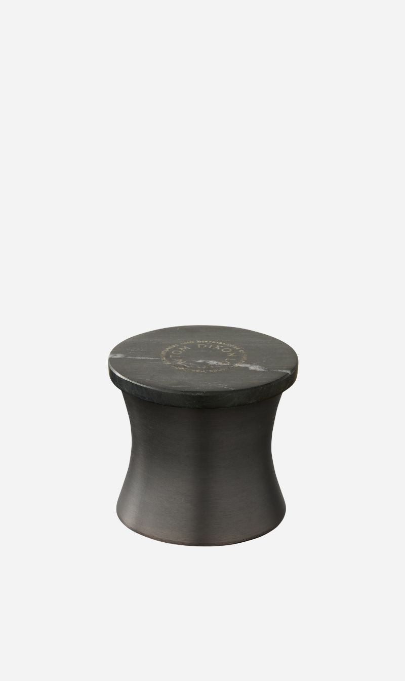 Influenced by the endless search to transform basic materials into a valuable substance, sharp black pepper, woody cypress, eucalyptus, exotic patchouli and smoky guaiac wood combine to create the precious perfume of Alchemy. Encased in a hand-spun matte black patina brass vessel, with a solid Udaipur black marble lid.