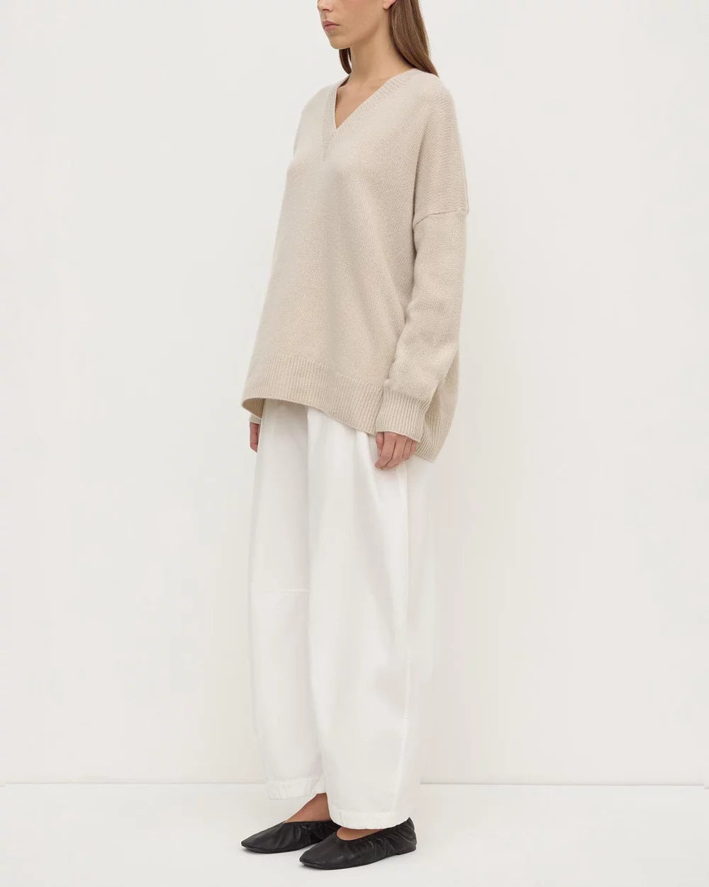 The Assembly Label Alora Cashmere V-Neck Knit is a pure cashmere knit designed with a relaxed fit, dropped long sleeves, and a classic V-neck.