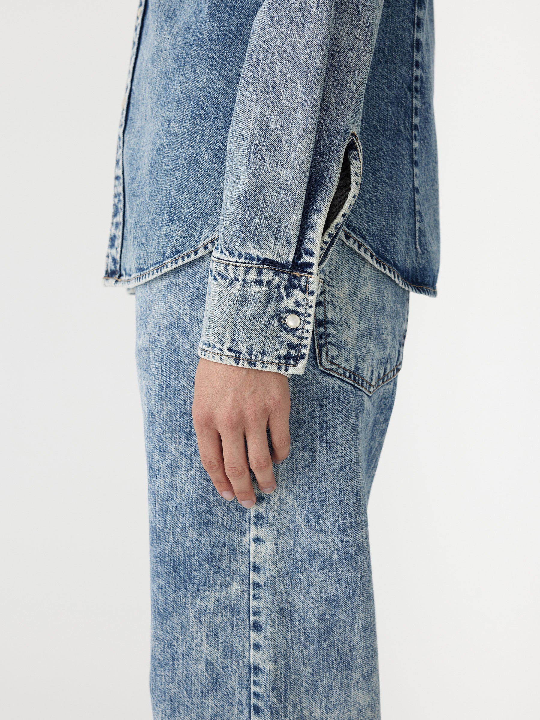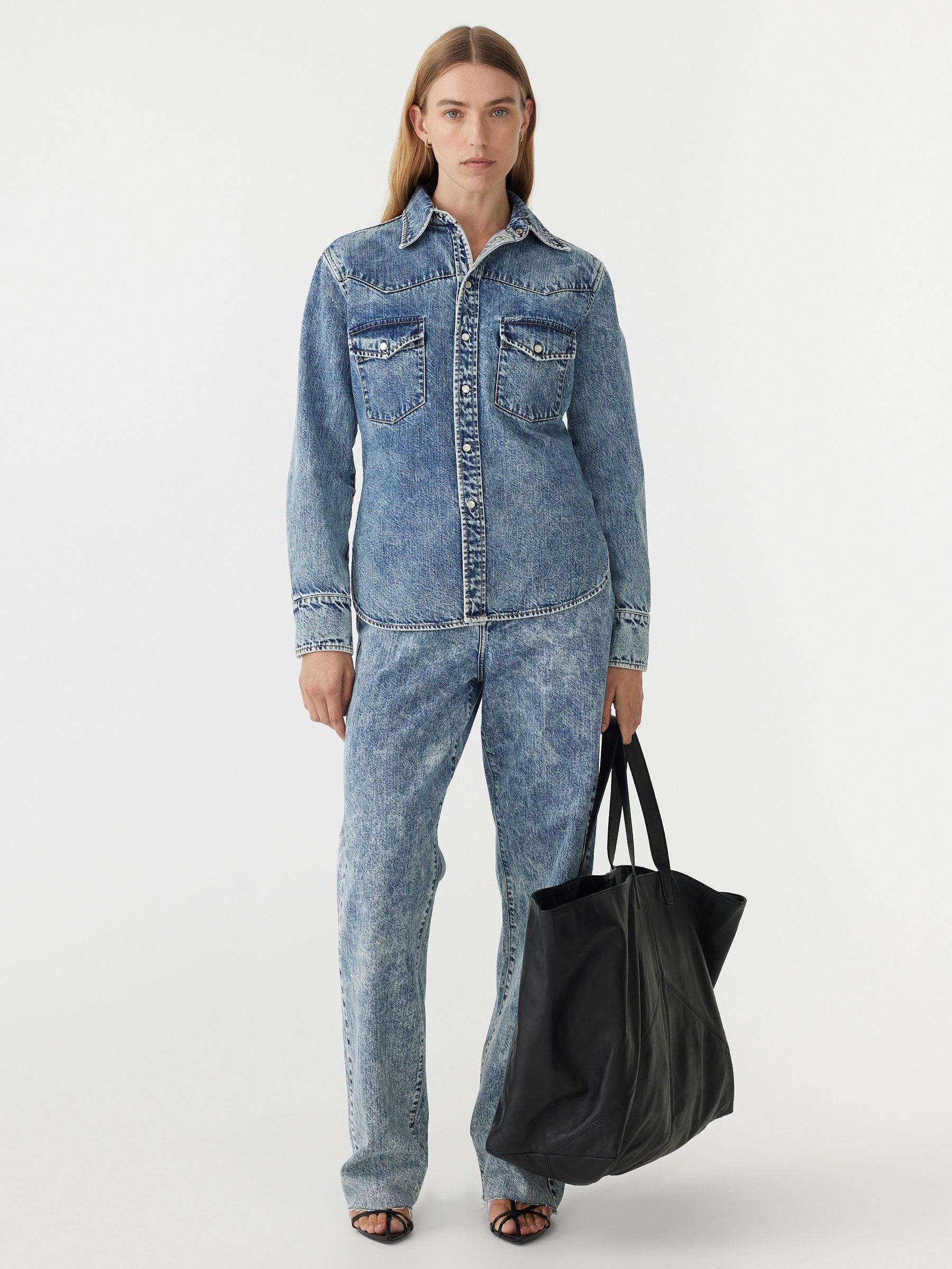A western style shirt featuring a pointed front and back yoke, front patch pockets, buttoned fastenings and pinstitch detailing in contrast bronze thread. Back waist darts give the denim darted western shirt shirt a refined, fitted shape. Derived from 100% organic cotton yarn which is spun and woven in one of the most traditional and highly regarded denim factories in Japan, the final garment is constructed in Melbourne, Australia.