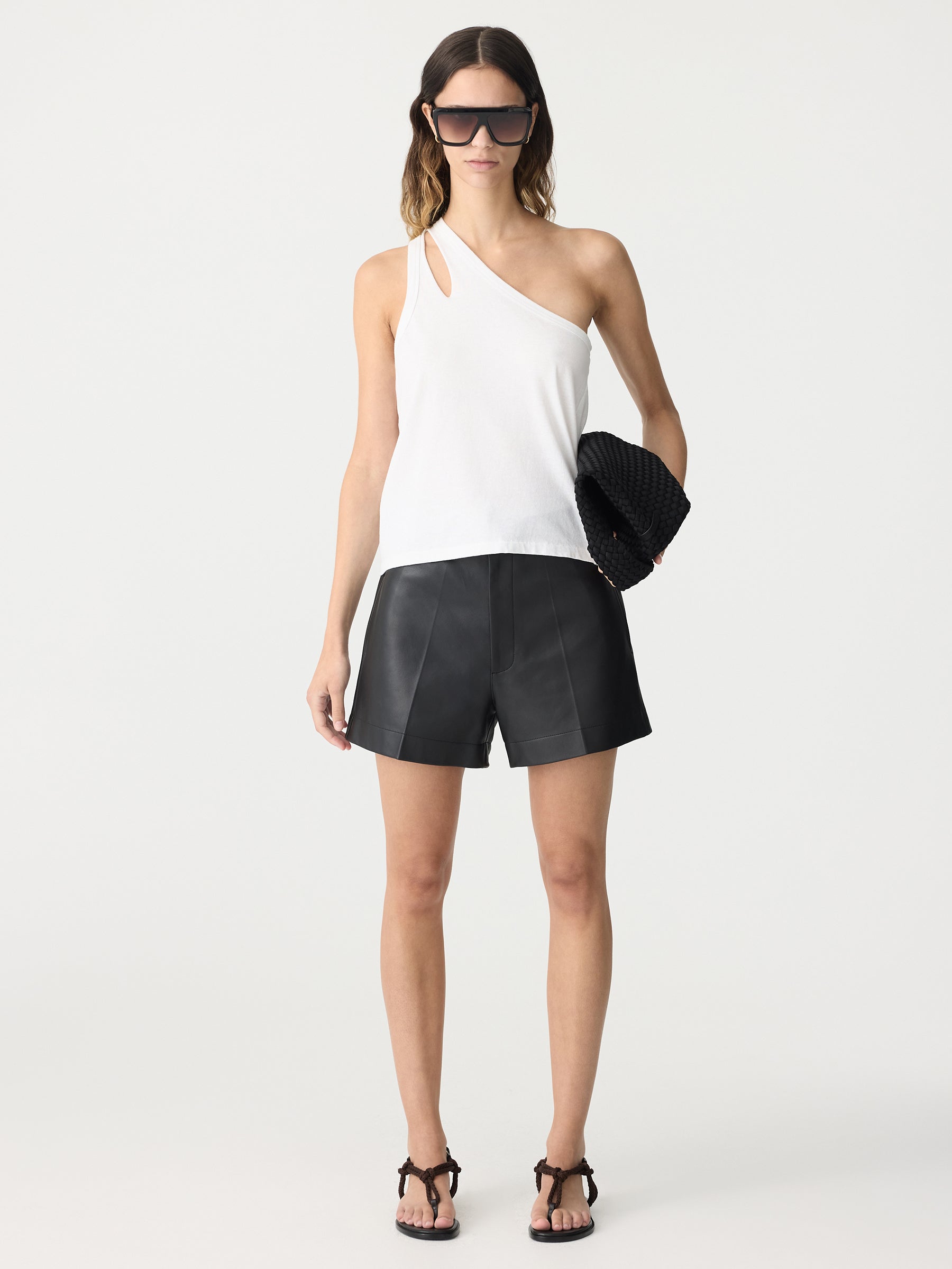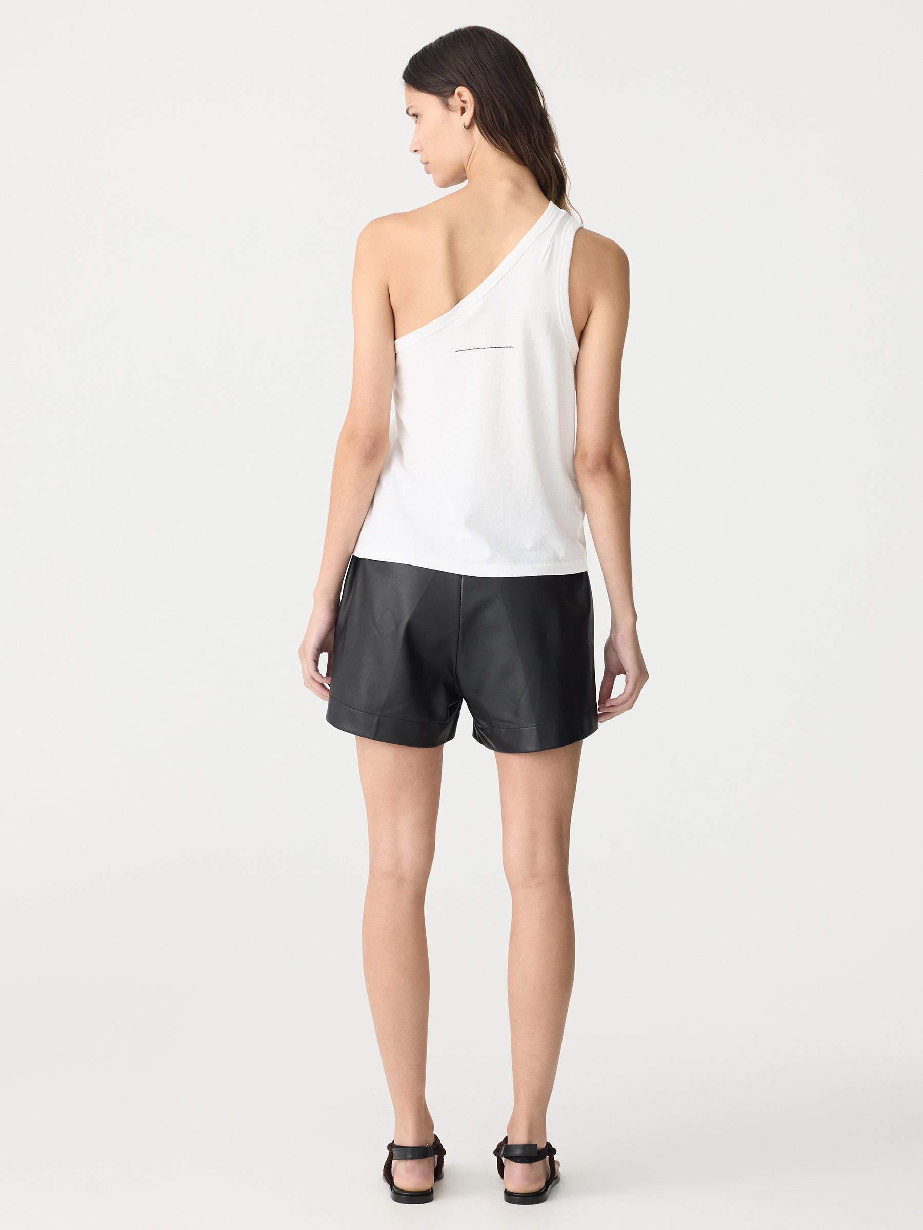 A minimalist staple with a difference, the spliced one shoulder tank offers a 100% lightweight organic cotton jersey construction. Designed with a slim fit, the final garment boasts a one shoulder silhouette and straight body hem. Refined by a splice raw detail over the shoulder.