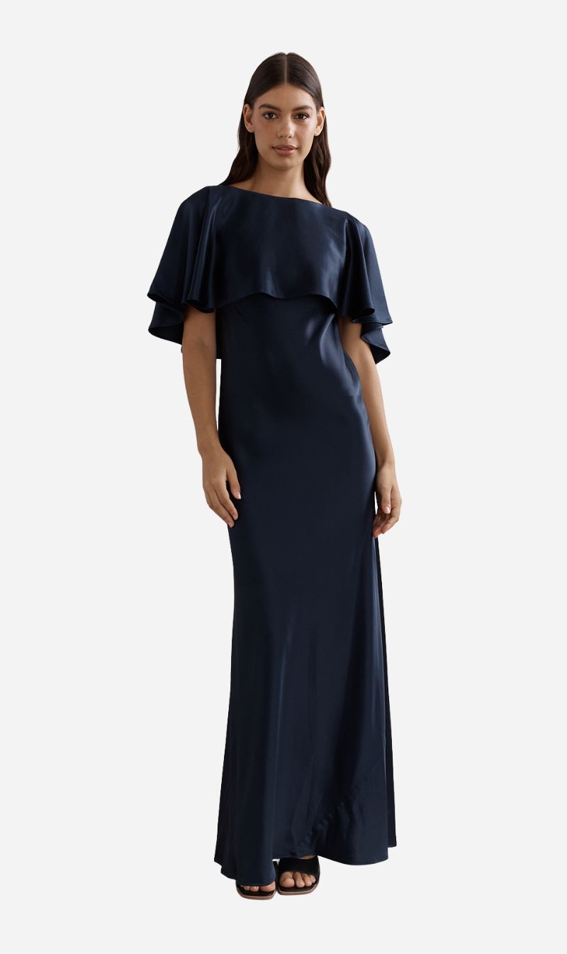 Introducing the Blair Gown by Caitlin Crisp. Crafted in fluid satin, this floor-length silhouette gently skims the body. The signature frillcape detail moves with you, adding effortless elegance. Perfect for weddings, formal events, and special occasions.