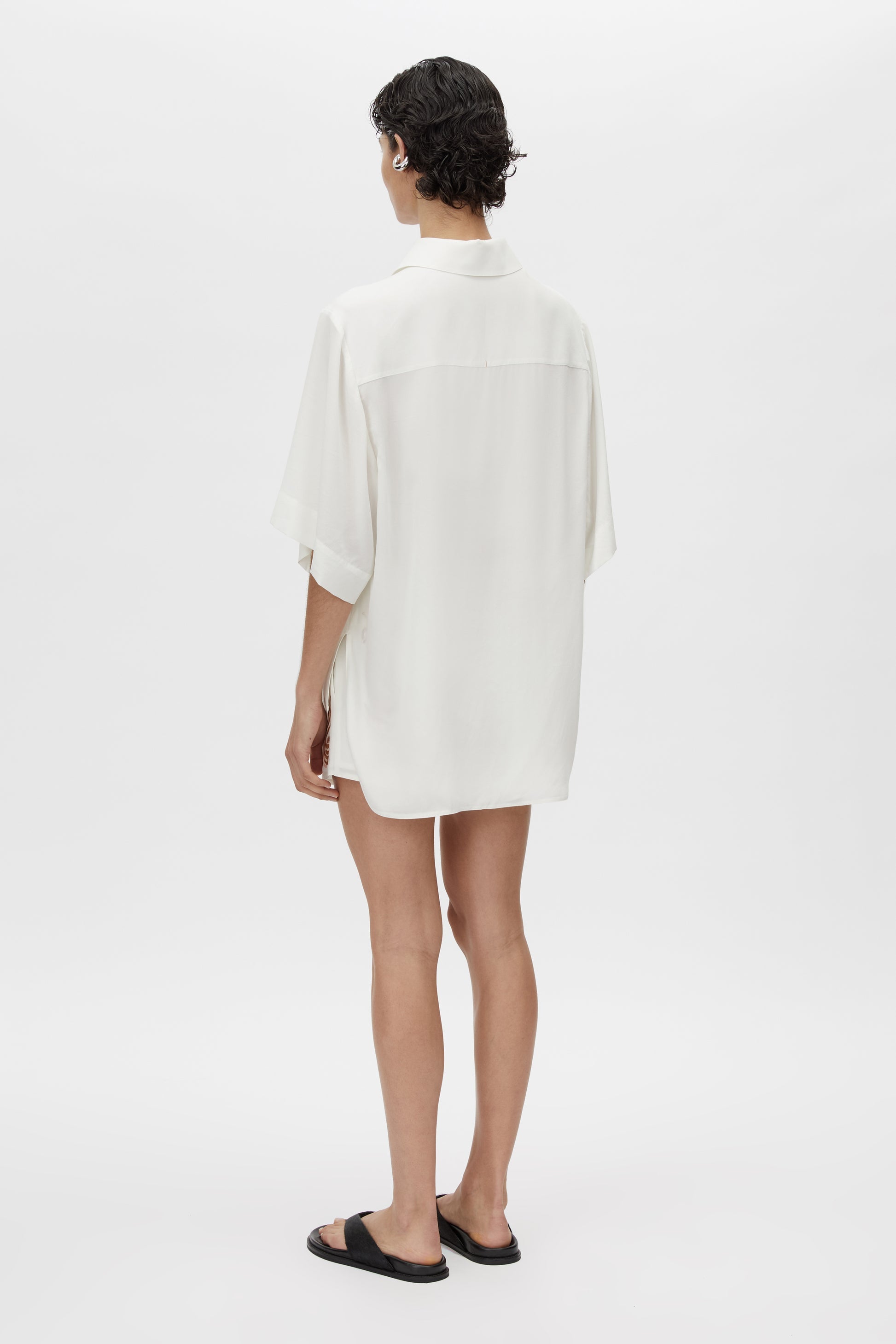 CAMILLA AND MARC Frida printed silk short-sleeve shirt with V-neckline. Boxy fit. Double hook-and-eye closure at centre front neckline. Side splits, curved hem.