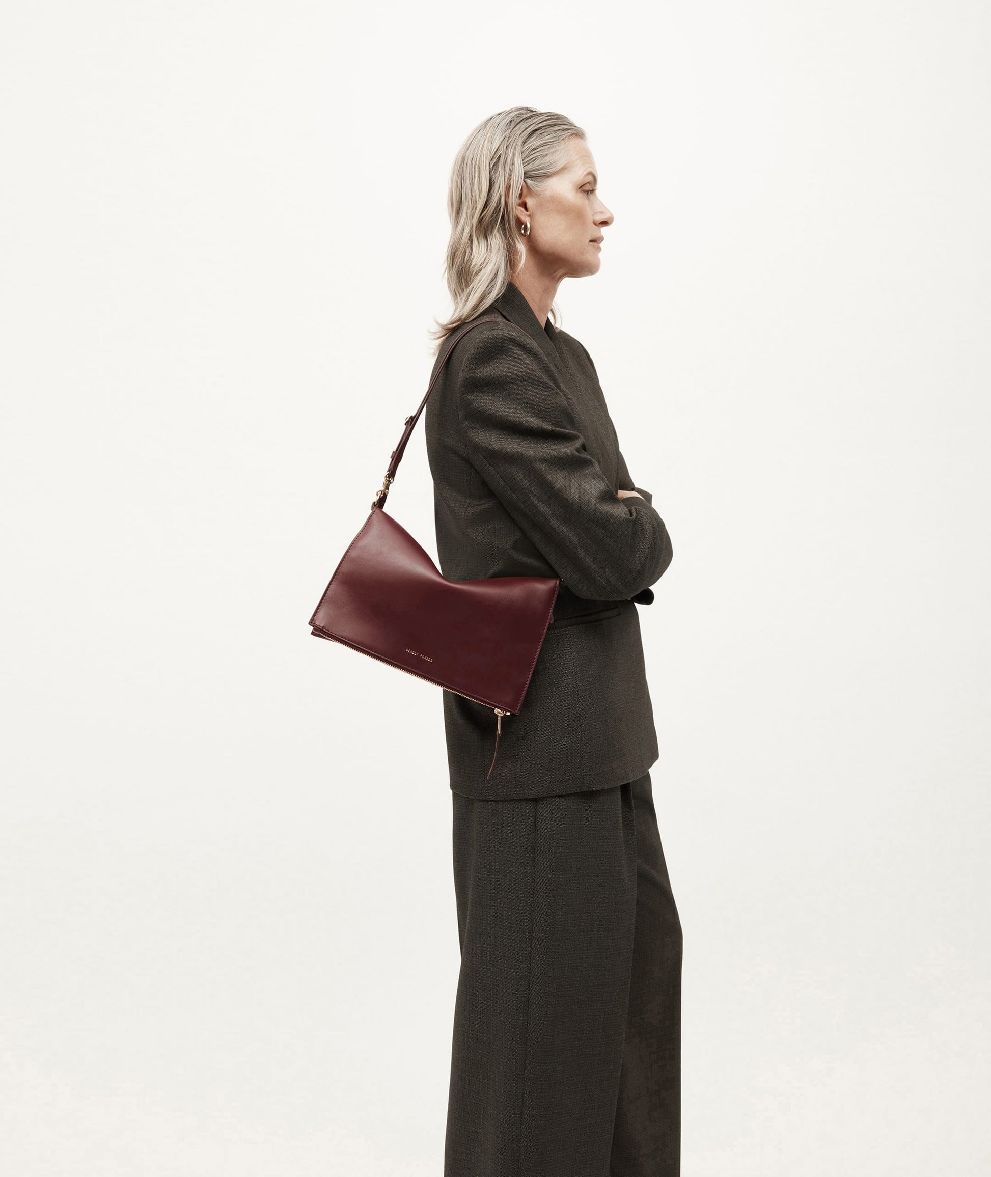 Mr Komodo in Radicchio features a structured silhouette, crafted from Ironed Calf Nappa. Designed for versatility, he can be worn on shoulder or as a crossbody. A signature brass zip and folded magnet keep belongings secure.