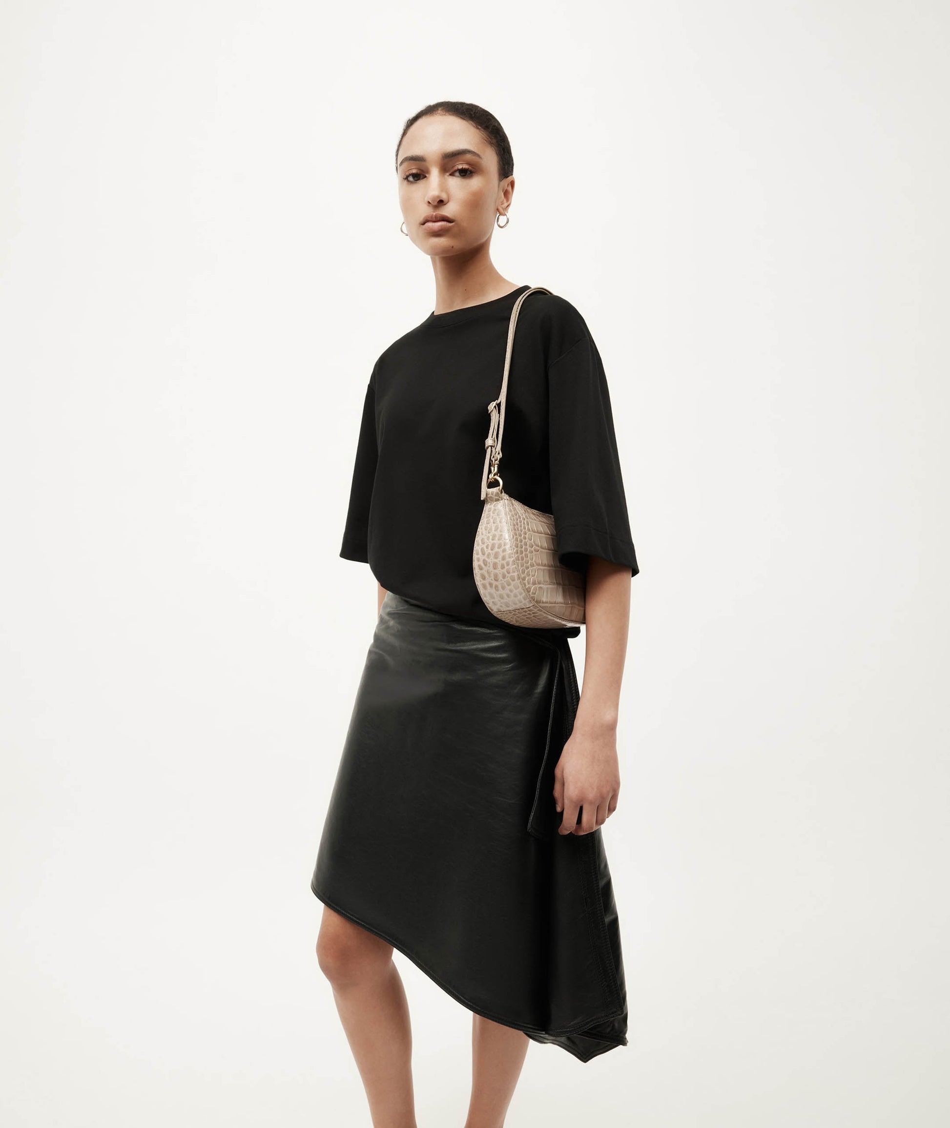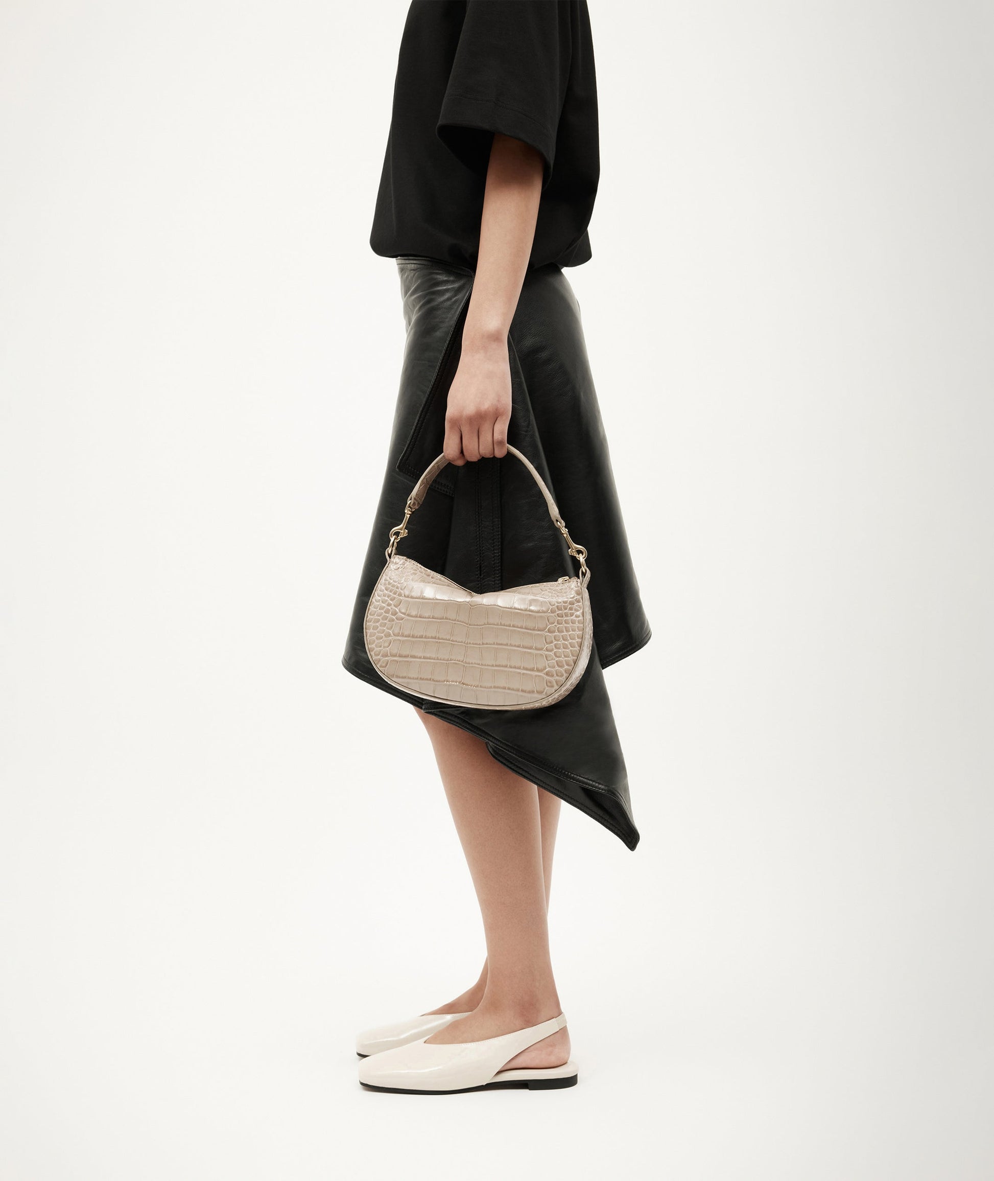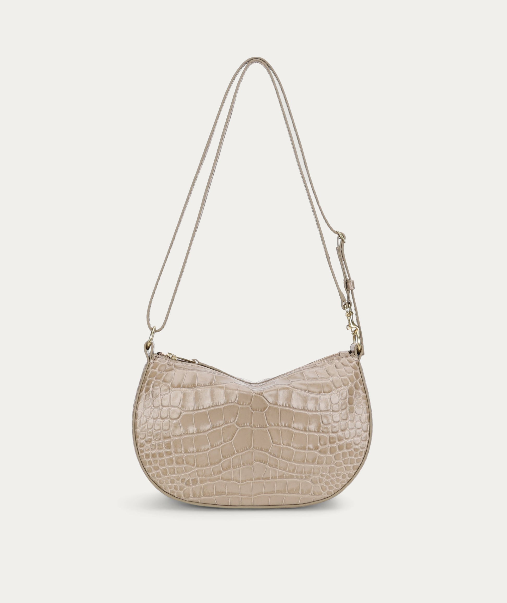 Petite in stature, Mr Sling Micro in Oat is crafted from hand-painted Croc-embossed Calf Leather. With a detachable top handle and adjustable strap, he offers versatile styling, while internal pockets and a brass zip closure keep essentials secure.