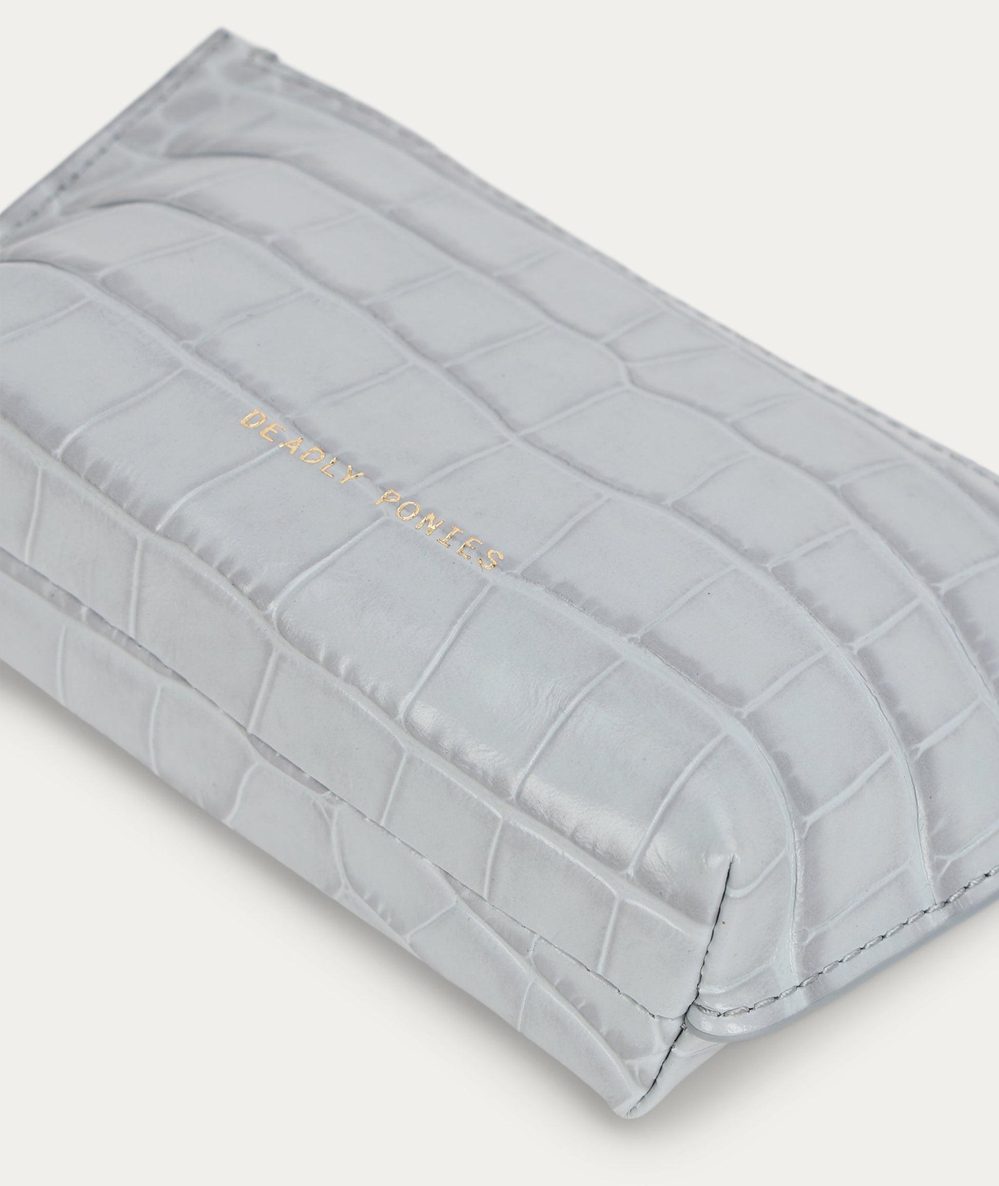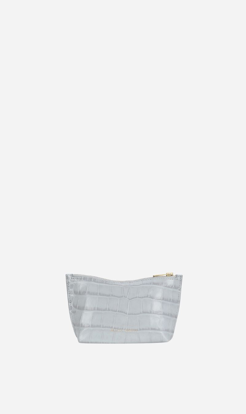 Compact, practical, and multifunctional. Hand-painted Croc-embossed Calf Leather gives Poucher in Iceberg a high-gloss finish. It features a zip closure with brass hardware.