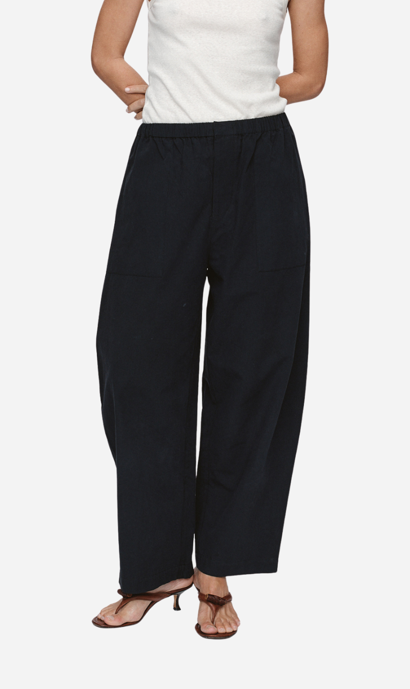 Pant is cut from crisp, lightweight cotton in a soft moss hue. The wide-leg silhouette falls with natural volume from a gently gathered elasticated waistband, creating effortless movement and comfort. Finished with oversized patch pockets for a utilitarian edge, these trousers balance structure and softness—ideal for pairing with fine knitwear or tonal separates for everyday