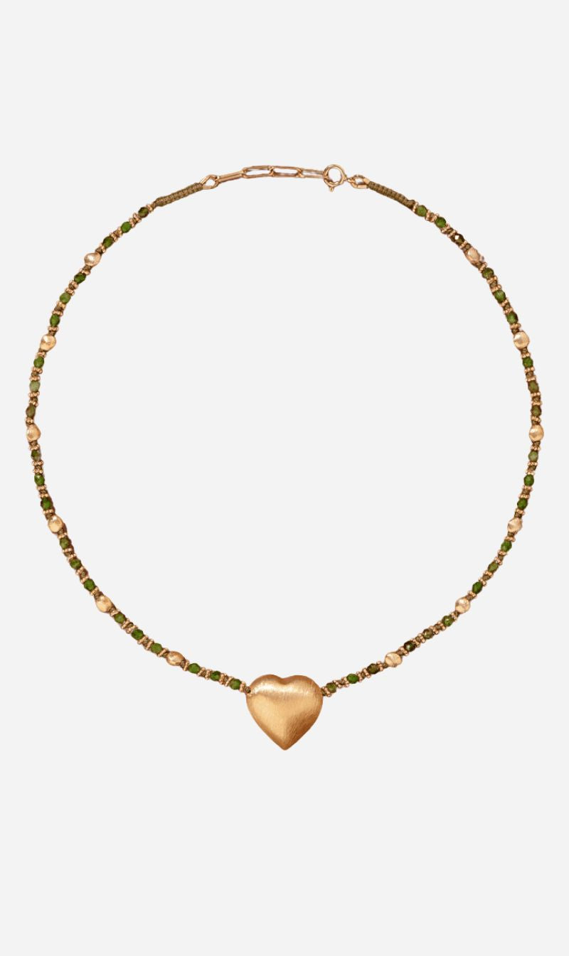 The Dil (दिल) collection, which means heart in Hindi, is a nod to the feelings and passions we can have. A delicately knotted heart on jewellery mounted on a beige thread that perfectly reveals the green of the diopside.