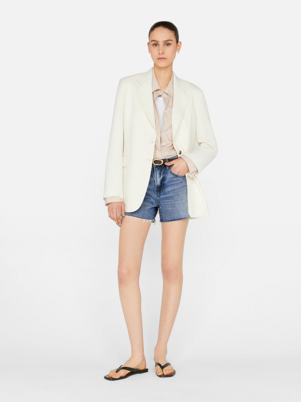 Le Brigette is a must-have for your warm weather wardrobe. These shorts feature a high rise and a raw hem that falls to the mid-thigh. Crafted from soft summerweight denim, this medium-indigo wash comes with distressed details and a frayed raw hem, giving it a stylish and laid-back look. You can easily dress them up or down, and they are the perfect addition to your getaway wardrobe.