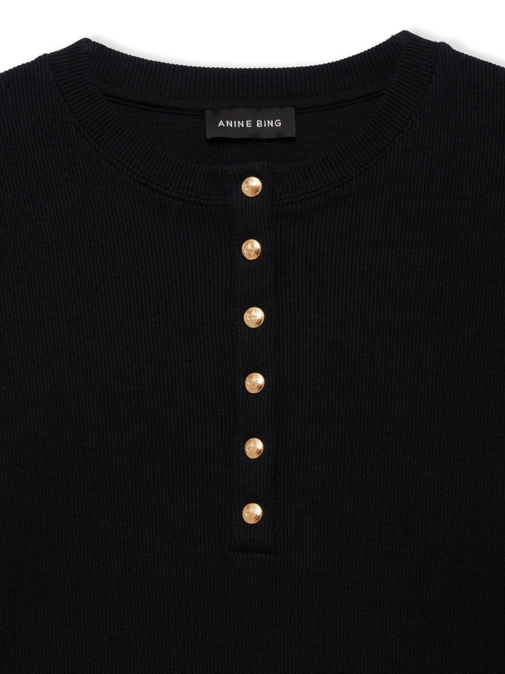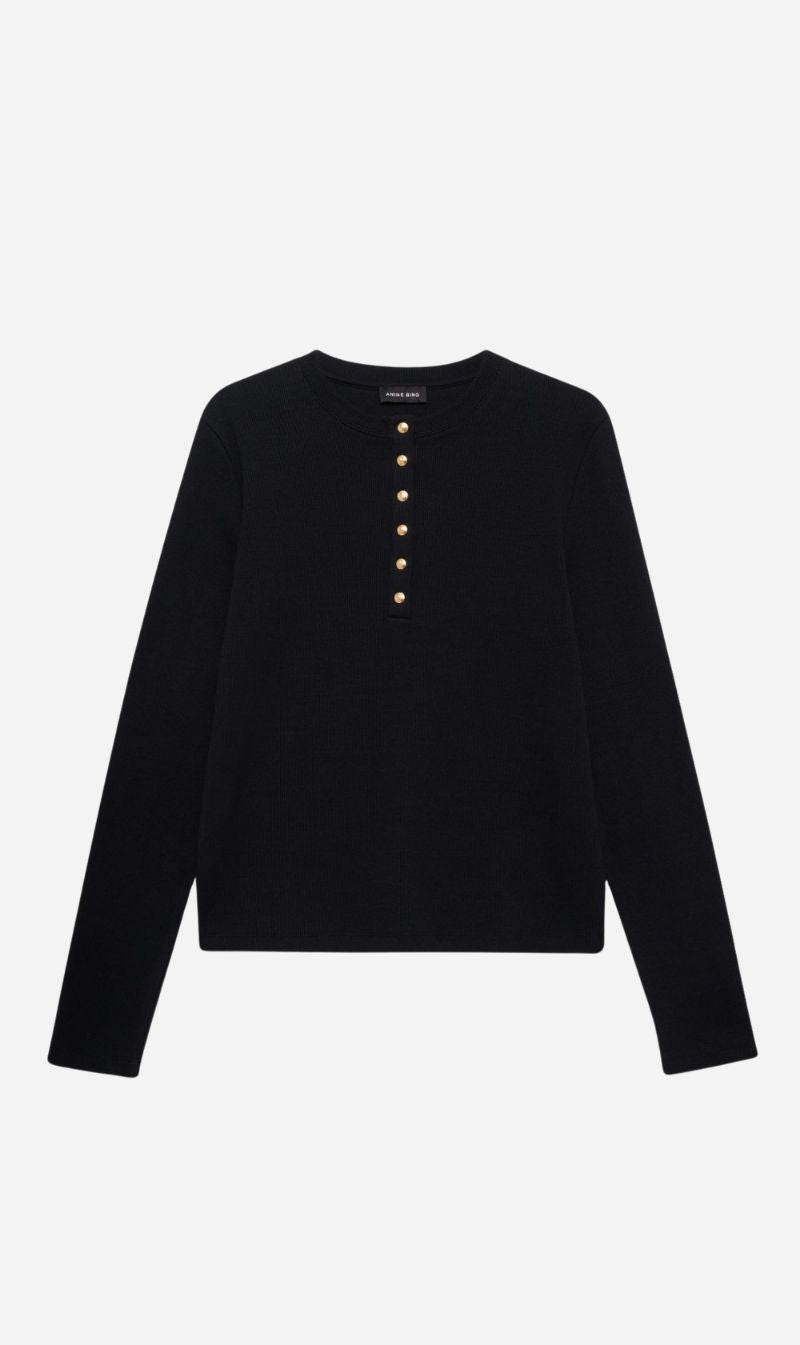 The Alessia Long Sleeve Tee is a modern Henley made from a dense cotton-spandex blend with an all-over ribbed texture and a soft hand. This elevated basic features a high crew neckline and gold monogram snap buttons along the front placket.